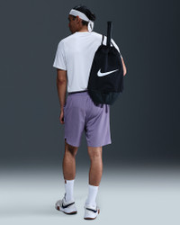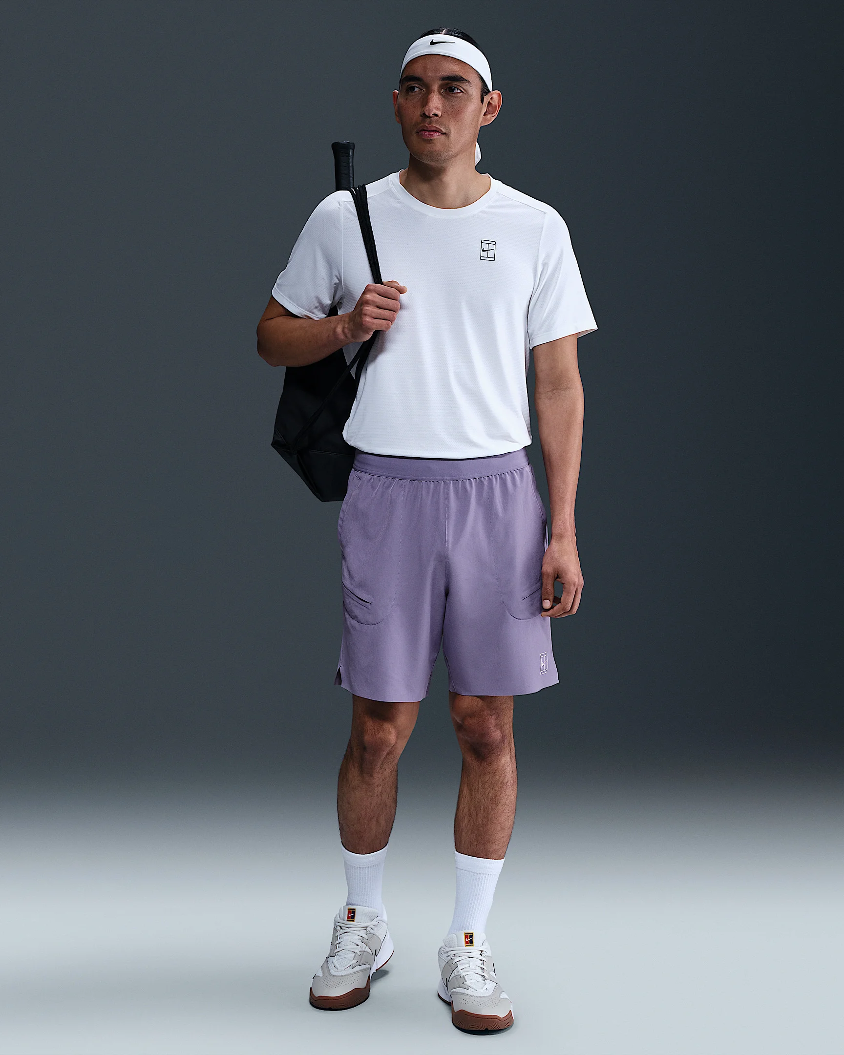The 8" Advantage shorts are built from sweat-wicking Dri-FIT fabric with 4-way stretch. Specialized pockets are designed to hold tennis balls securely during play. Benefits - Nike Dri-FIT technology moves sweat away from your skin for quicker evaporation, helping you stay dry and comfortable. - Stretchy woven material feels lightweight and breathable. - Slightly angled pleats at the bottom of each pocket expand to let tennis balls drop into your pocket and stay secure while you play. - Low-profile hems help reduce chafing. Product Details - 8" inseam - Elastic waistband with drawcord - Reinforced side vents - NikeCourt logo - Body: 89% polyester/11% spandex. Pocket bag palm side: 100% polyester. - Machine wash - Imported - Shown: Dusty Amethyst/White - Style: FZ9322-527 SIZE & FIT Model is wearing size M and is 5′11″179cm Standard fit: easy and traditional