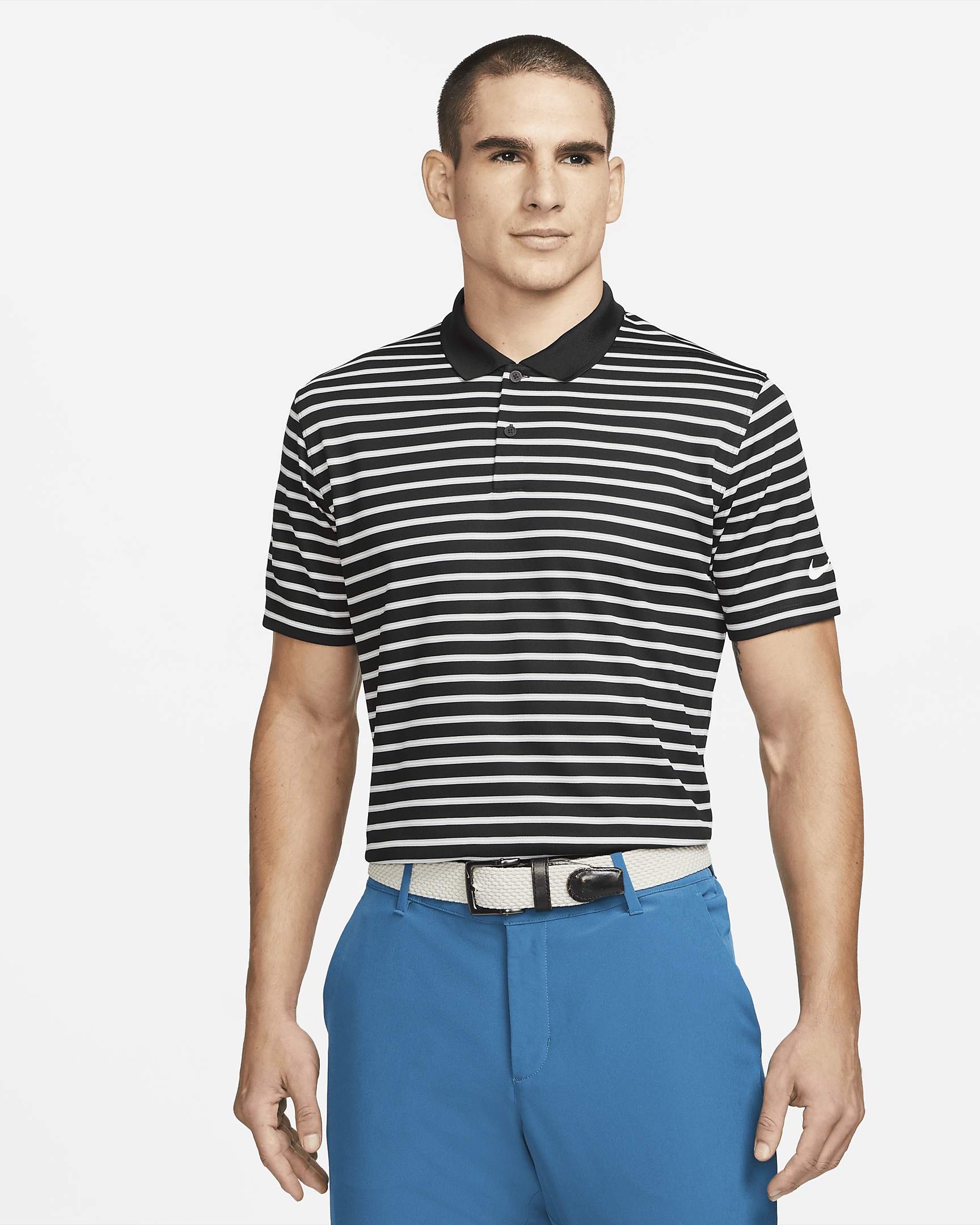 Crafted from striped, sweat-wicking fabric that's made from 100% recycled polyester fibers, the Nike Dri-FIT Victory Polo puts a new spin on golf performance. Benefits - Nike Dri-FIT technology moves sweat away from your skin for quicker evaporation, helping you stay dry and comfortable. - Shoulder seams are rolled forward so you can fully power through your swing. - Collar is ribbed to help prevent curling. - Swoosh is on the left sleeve so you can easily apply custom graphics like a logo or a crest to the chest. Product Details - Standard fit for a relaxed, easy feel - 2-button placket - 100% polyester - Machine wash - Imported - Shown: Black/White - Style: DH0835-010 SIZE & FIT Model is wearing size M and is 5'4"164cm Big & Tall model is wearing size 2XL and is 6'5"196cm Standard fit: easy and traditional