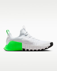 From power lifts to ladders, from grass blades to grainy platforms, from the turf to the track your workout has a certain purpose, a specific focus. The Free Metcon 6 supports every grunt, growl and “got it!” We added even more forefoot flexibility to our most adaptable trainer and reinforced the heel with extra foam. That means more freedom for dynamic movements during plyos and cardio classes, plus the stable base you need for weights. More Benefits - Multi-surface traction pattern is made for any workout surface and activity. - Comfortable inner sleeve increases ankle support and provides a more seamless fit. Product Details - Shown: White/Green Strike/Black/Black - Style: FJ7127-107