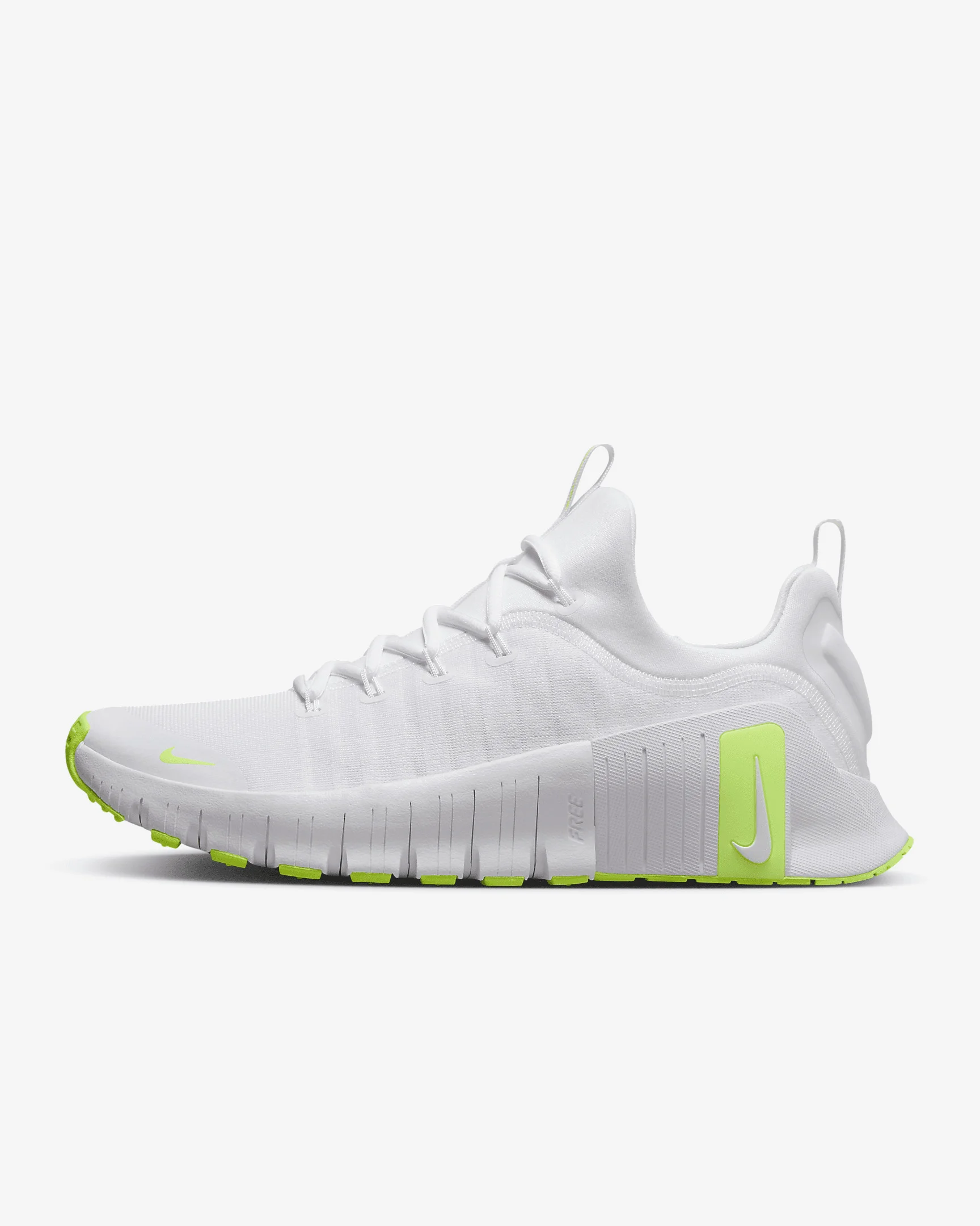 From power lifts to ladders, from grass blades to grainy platforms, from the turf to the track your workout has a certain purpose, a specific focus. The Free Metcon 6 supports every grunt, growl and “got it!” We added even more forefoot flexibility to our most adaptable trainer and reinforced the heel with extra foam. That means more freedom for dynamic movements during plyos and cardio classes, plus the stable base you need for weights. More Benefits - Multi-surface traction pattern is made for any workout surface and activity. - Comfortable inner sleeve increases ankle support and provides a more seamless fit. Product Details - Shown: White/White/Volt - Style: FJ7127-104