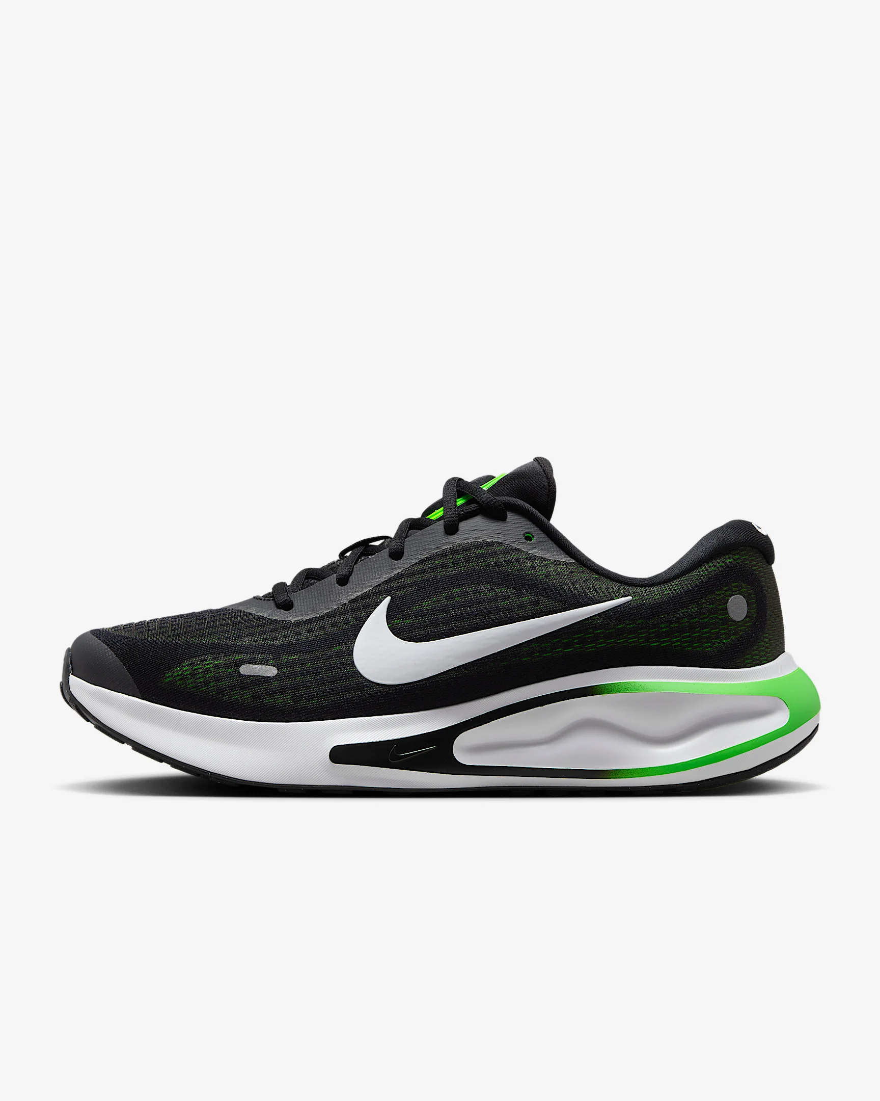 Enjoy every step, route and jaunt in the Nike Journey Run. It’ll have you striding and smiling on punishing pavements, thanks to an extra-high foam stack and supersoft ComfiRide cushioning. It's so comfortable that you'll already be looking forward to lacing 'em up again. Product Details - Reflective details - Not intended for use as Personal Protective Equipment (PPE) - Shown: Black/Green Strike/Green Shock/White - Style: FN0228-007