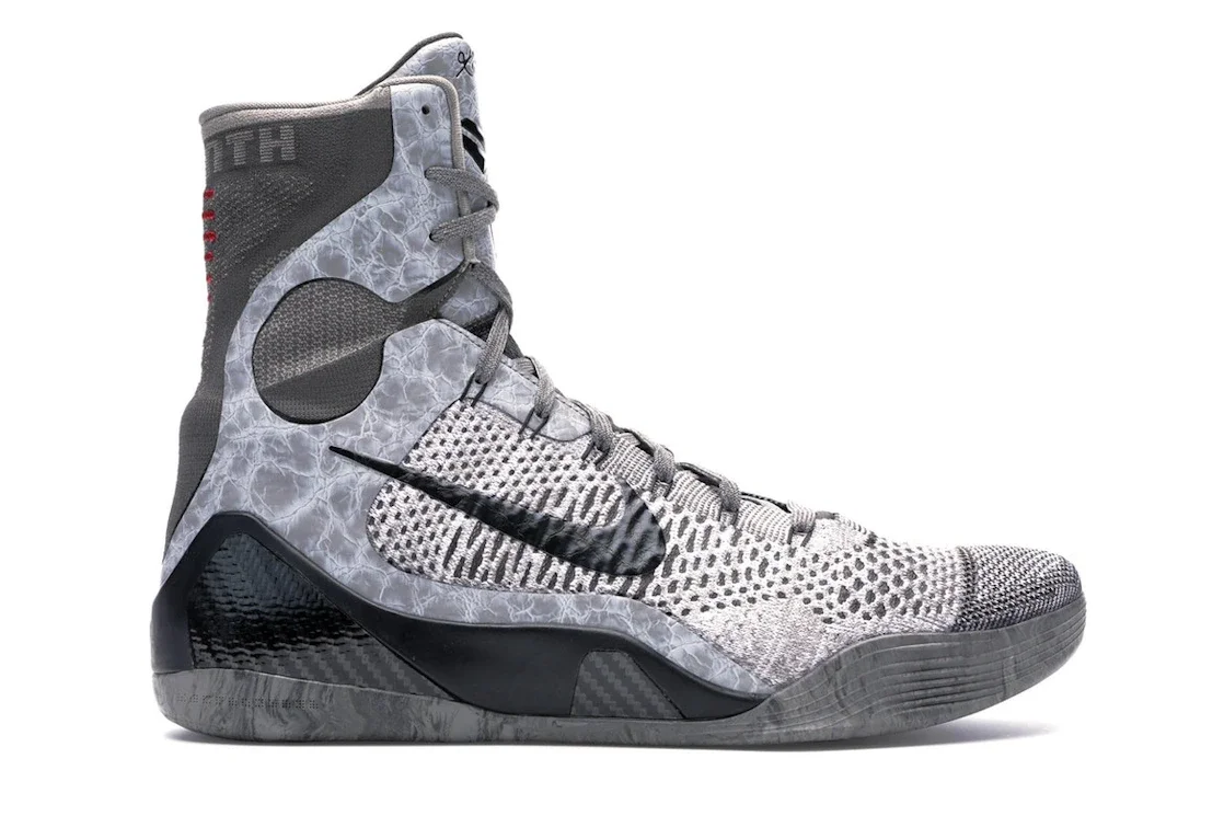 The Nike Kobe 9 Elite Detail is an arresting high top that fuses an artistic design with high performance sneaker technology. The subtle Base Gray and black colorway of the "Detail" version of the Nike Kobe 9 Elite is inspired by Italian Renaissance art. The base of the upper is light gray FlyKnit supported with underlying FlyWire. Textured and patterned gray leather overlays undulate along the side panel and up the collar, while black FlyKnit that matches the side panel Swoosh covers the heel. Hits of carbon fiber accent the mudguard, and flat gray laces crisscross over a padded gray tongue with Kobe's sword-in-sheath logo. Kobe branding with nine red hash marks adorns the heel. What our experts appreciate most about this sneaker is the Lunarlon foam midsole that cushions with springy bounce and evenly distributes weight and pressure. The black and gray outsole features computer data-generated traction. The Nike Kobe 9 Elite Detail was released on March 22, 2014, for a retail price of $225. - Style 630847-003/641714-004 - Colorway Base Grey/Black - Retail Price 225 - Release Date 2014-03-22 - Featured false - Product Line Nike Kobe