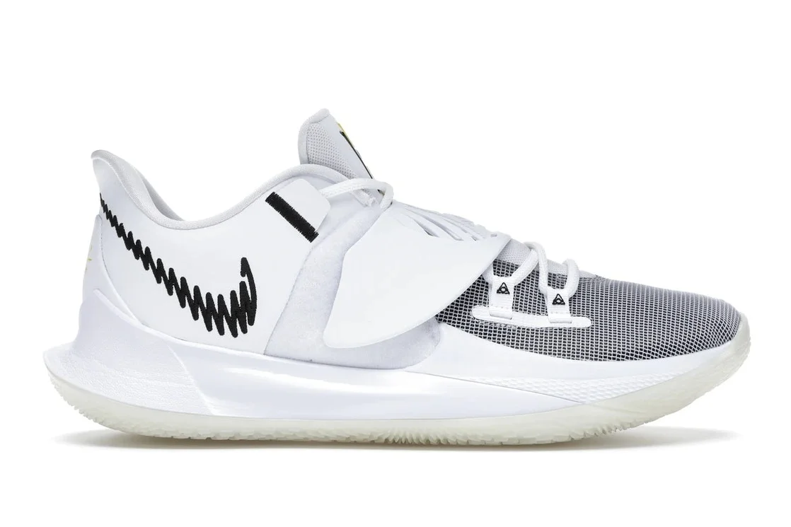 The Nike Kyrie Low 3 White Black Glow is the third edition of the Kyrie Low series and was made as part of a collaboration between Nike and basketball superstar Kyrie Irving. The Kyrie Low 3 White Black Glow features a low-cut design that allows for greater ankle flexibility and movement, which is crucial for quick cuts and changes of direction. The shoe also has a Zoom Air unit in the forefoot that offers responsive cushioning and absorbs impact when landing from jumps. The sneaker has a curved outsole pattern that provides grip and stability on the court. We think that one of the most noticeable aspects of the Low Kyrie 3 in White Black Glow is its sleek and stylish look. It features a white upper with black accents around the sides and on the Nike logo. The Nike Kyrie Low 3 White Black Glow was released on July 1st, 2020 at a retail price of $110. - Style CJ1286-100/CJ1287-100 - Colorway White/Black - Retail Price 110 - Release Date 2020-07-01 - Featured false - Product Line Nike Kyrie
