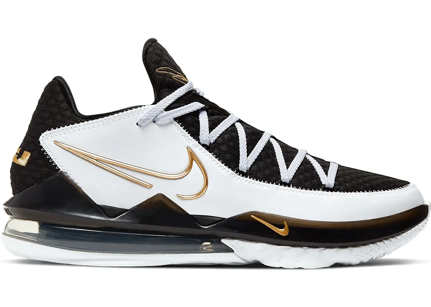 The Nike LeBron 17 Low White Metallic Gold was inspired by LeBron James' relentless pursuit of greatness, featuring a clean white colorway with Metallic Gold accents. The LeBron 17 Low 'Metallic Gold' presents a combination of black and white colors along with elegant gold detailing on the branding components, such as the outlined Swoosh on the side panel. Its upper combines black mesh with a white leather overlay, providing a harmonious blend of breathability and durability. The midsole combines responsive React foam in the forefoot for agility and cushioning, while a visible Max Air unit in the heel ensures optimal impact protection. The sock liner is adorned with a gold sheriff's badge graphic, completing the shoe's aesthetic. Our team believes that the standout feature of The LeBron 17 Low 'Metallic Gold' is the gilded accents on the sneaker's branding elements, particularly the outlined Swoosh on the quarter panel. Combining black and white with gold accents creates a bold contrast that enhances the shoe's aesthetic appeal. The Nike LeBron 17 Low White Metallic Gold was released on April 1st, 2020, and sold at $170. - Style CD5006-101/CD5007-101 - Colorway White/Metallic Gold-Black - Retail Price 170 - Release Date 2020-04-01 - Featured false - Product Line Nike LeBron