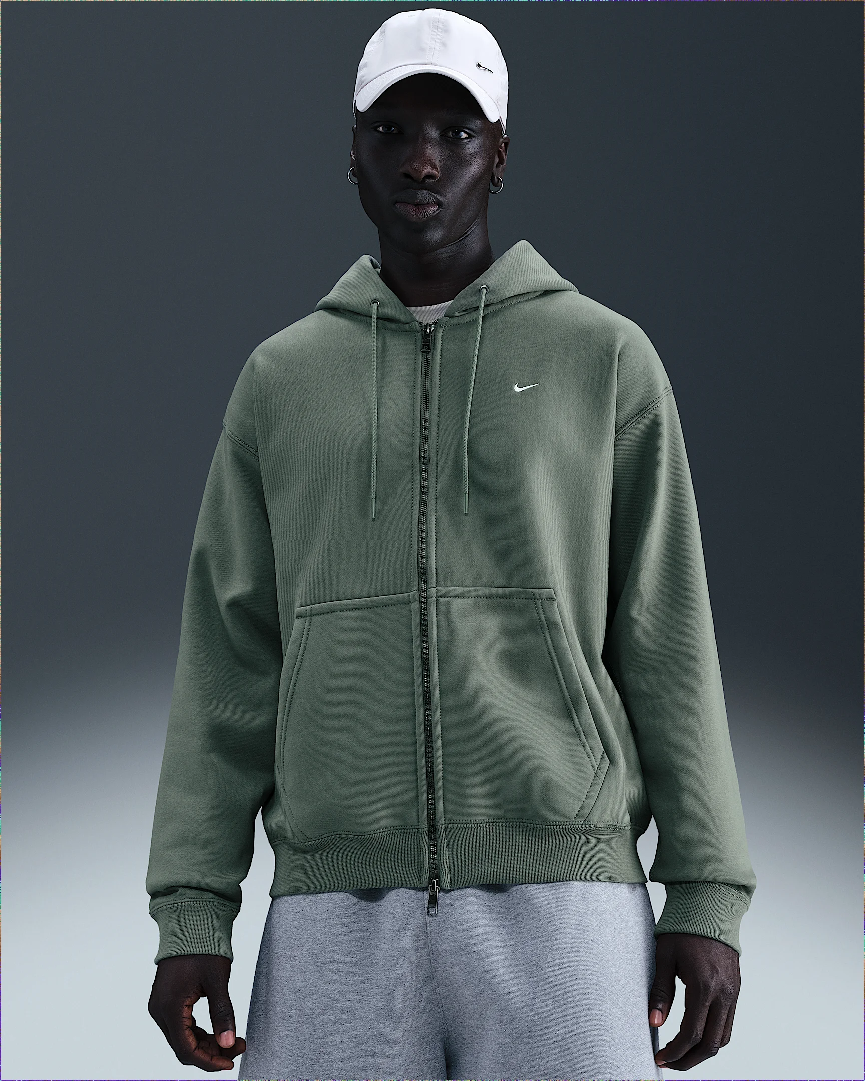 Bring a touch of luxury to your casual, cool-weather layers with this warm and structured hoodie. It's crafted with a heavyweight brushed fleece that feels plush on the inside and smooth on the outside. Benefits - Loose fit feels roomy through the body. - Single-panel, lined hood is equipped with a drawcord for adjusting the fit. Product Details - Embroidered Nike Swoosh logo - Divided kangaroo pocket - Two-way zipper - Ribbed openings - Body: 84-85% cotton/15-16% polyester. Hood lining: 84-85% /cotton/15-16% polyester. - Material percentages may vary. Check label for actual content. - Machine wash - Imported - Shown: Clay Green/Clay Green/White - Style: HV1084-364 SIZE & FIT Loose fit: roomy and relaxed