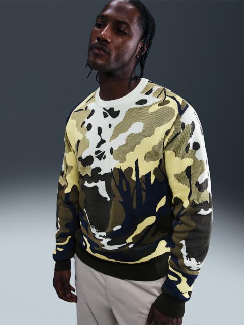 This sweater brings the outdoors to your everyday. The soft knit design depicts runners on Hollister Trail, a 1.4 mile runners loop just outside of Nike Campus in Beaverton, OR. Its loose fit feels roomy through the body. Product Details - Embroidered Nike Swoosh logo - 65% polyester/33% rayon/1% nylon/1% spandex. - Hand wash - Imported - Shown: Celestine Blue/Chlorophyll - Style: HV0886-441 SIZE & FIT Model is wearing size M and is 6′1″185cm Loose fit: roomy and relaxed
