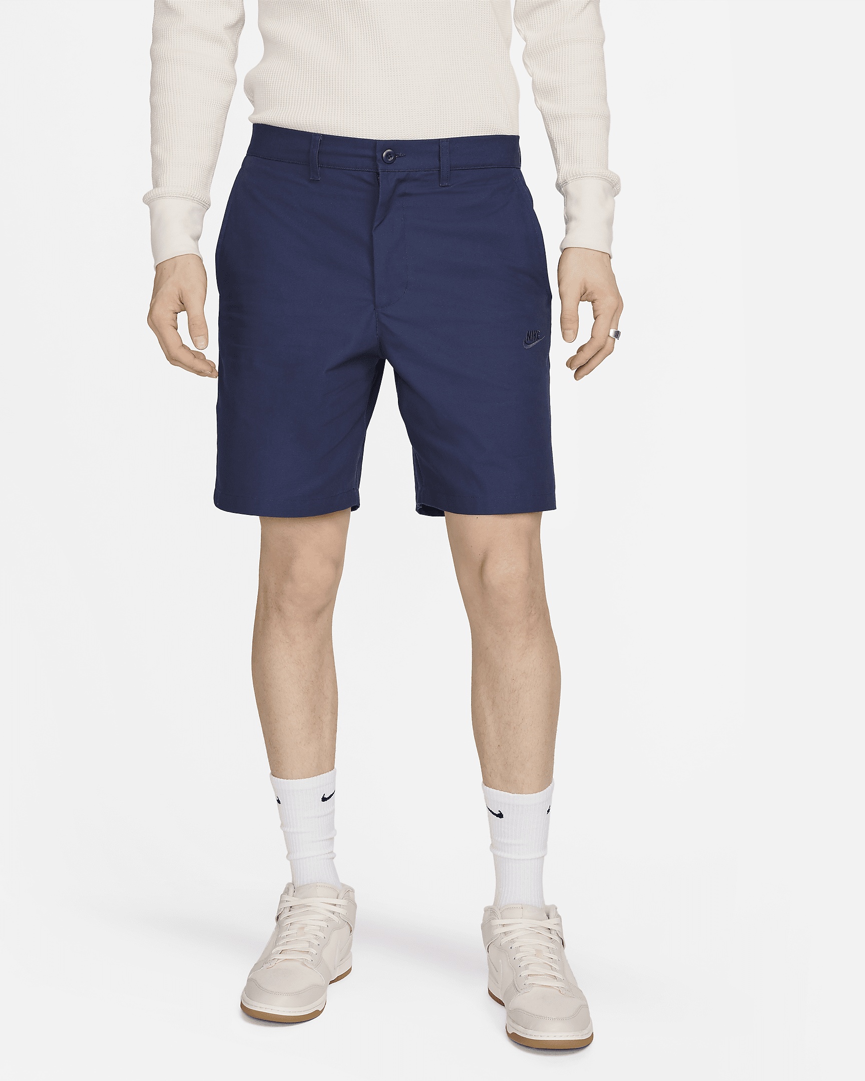Keep it classic in a pair of these chino shorts from our Nike Club collection. The straight-leg, relaxed fit is designed to feel comfy through the seat and thighs. Pull them on with a polo or tee and your favorite Nike sneakers for a classic look that's ready for some fun in the sun. Benefits - Lightweight woven cotton canvas is durable and breathable. - Designed to feel relaxed through the seat and thighs for everyday comfort. - Belt loops with a zippered fly and button closure help you find the right fit. Product Details - Hand pockets - Back welt pockets - Belt loops - Zipper fly - Woven Nike Futura label at back right pocket - 100% cotton - Machine wash - Imported - Shown: Midnight Navy/Midnight Navy - Style: FZ5772-410 SIZE & FIT Model is wearing size 32 and is 6′3″191cm Standard fit: easy and traditional