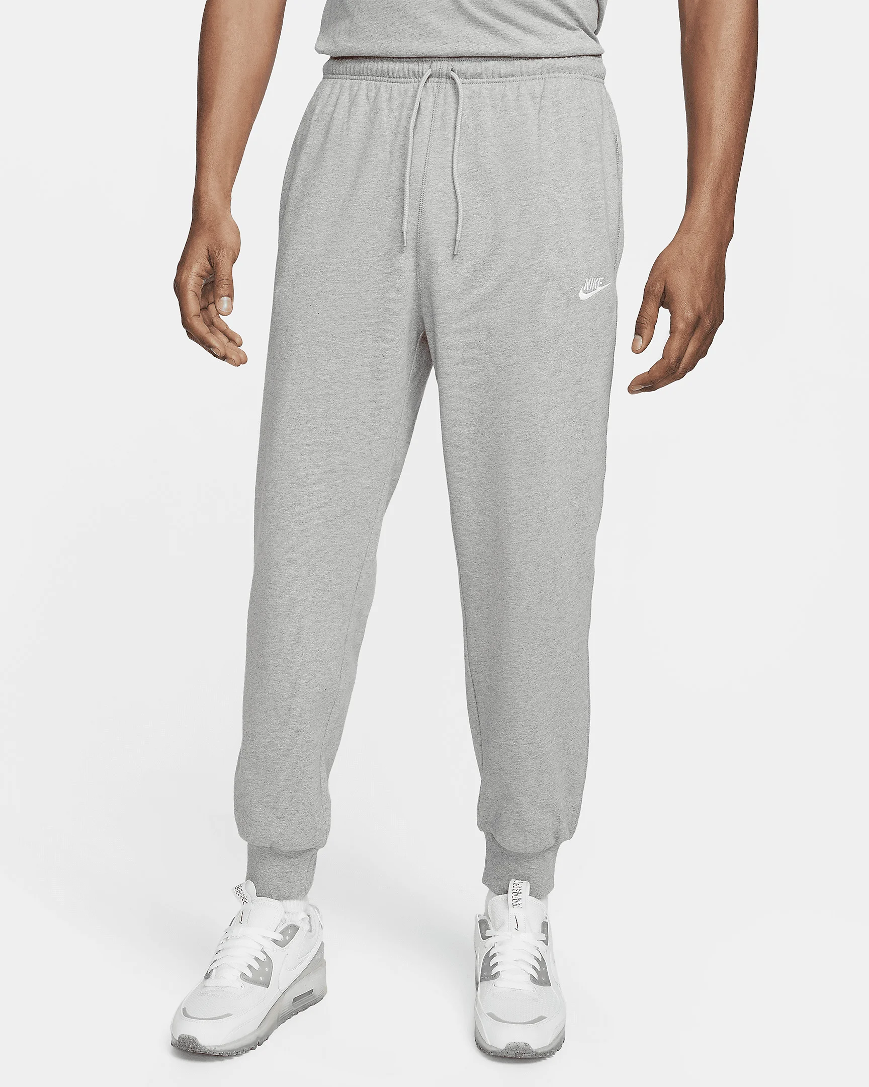 East to style and comfortable to wear, our Nike Club knit joggers are ready to become a versatile piece of your casual wardrobe. The relaxed fit is designed to give you a bit of room through the seat and thighs. The slight taper and ribbed ankle cuffs keep it clean around your sneakers. Pull them on with a tee or your favorite hoodie for casual, everyday wear. Benefits - Soft knit fabric feels smooth and lightweight for all-day comfort. - Stretchy elastic waist with external drawcord lets you find the right fit. - Ribbed ankle cuffs give you a clean look that highlights your kicks. Product Details - Hand pockets - Embroidered Nike Futura logo at left thigh - Body: 100% cotton. Rib: 98% cotton/2% spandex. - Machine wash - Imported - Shown: Dark Grey Heather/White - Style: FQ4330-063 SIZE & FIT Model is wearing size M and is 6′2″188cm Big & Tall model is wearing size 3XL and is 6'3"189cm Standard fit: easy and traditional