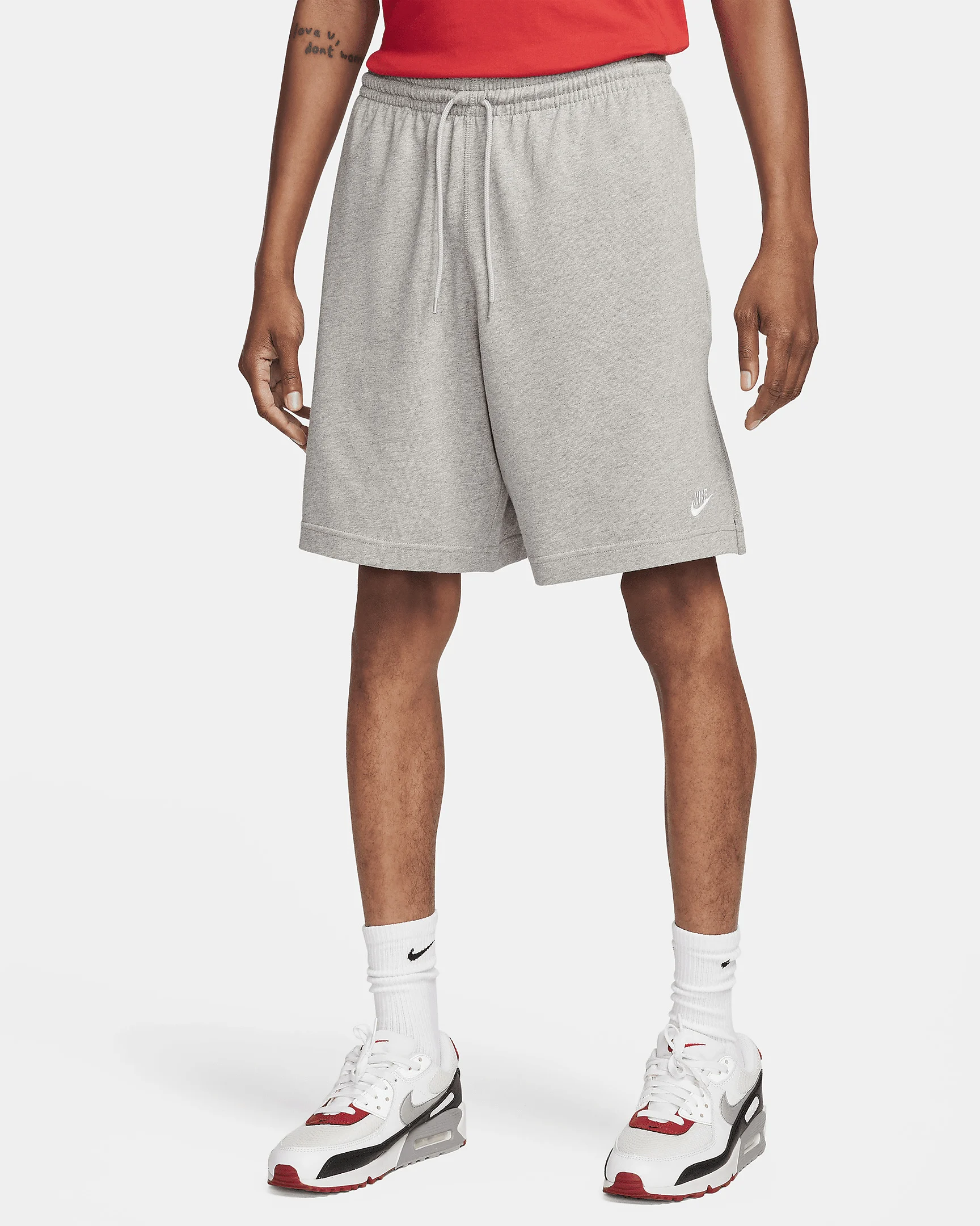 Looking for lightweight, breathable comfort in the sun? Pull on a pair of these shorts from our Nike Club collection. The above-the-knee cut is designed to feel relaxed through the seat and thighs for casual, daily wear. An embroidered Nike Futura logo brings a subtle sport-inspired finish. Benefits - Soft knit cotton feels comfy and breathable for everyday comfort. - Designed to feel relaxed through the seat and thighs for casual, daily wear. - Soft elastic waist with outer drawcord helps you cinch up the right fit. Product Details - 100% cotton - Machine wash - Imported - Shown: Dark Grey Heather/White - Style: FQ4359-063 SIZE & FIT Model is wearing size M and is 6′1″185cm Big & Tall model is wearing size 3XL and is 6'5"196cm Standard fit: easy and traditional
