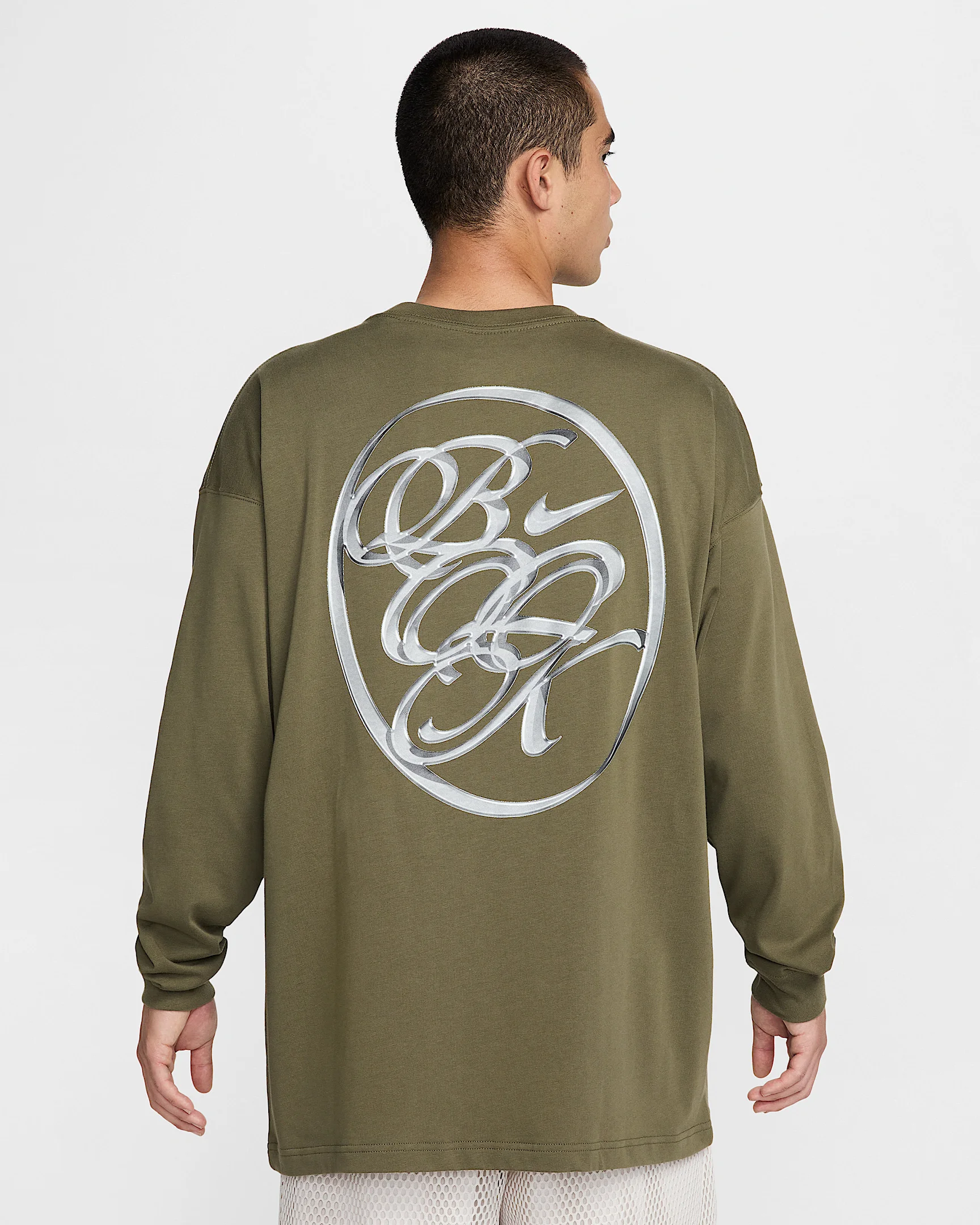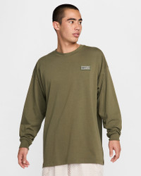 This elevated take on a classic long-sleeve tee brings an oversized fit, an embroidered logo patch and soft, heavyweight cotton for a structured feel. Benefits - Heavyweight cotton fabric has a stiff drape and structured feel. - Premium metal trim on Swoosh logo inspired by Booker's love for classic cars. Product Details - Ribbed collar - 100% cotton - Machine wash - Imported - Shown: Medium Olive - Style: HJ3344-222 SIZE & FIT Model is wearing size M and is 5′11″180cm Oversized fit: exaggerated and spacious