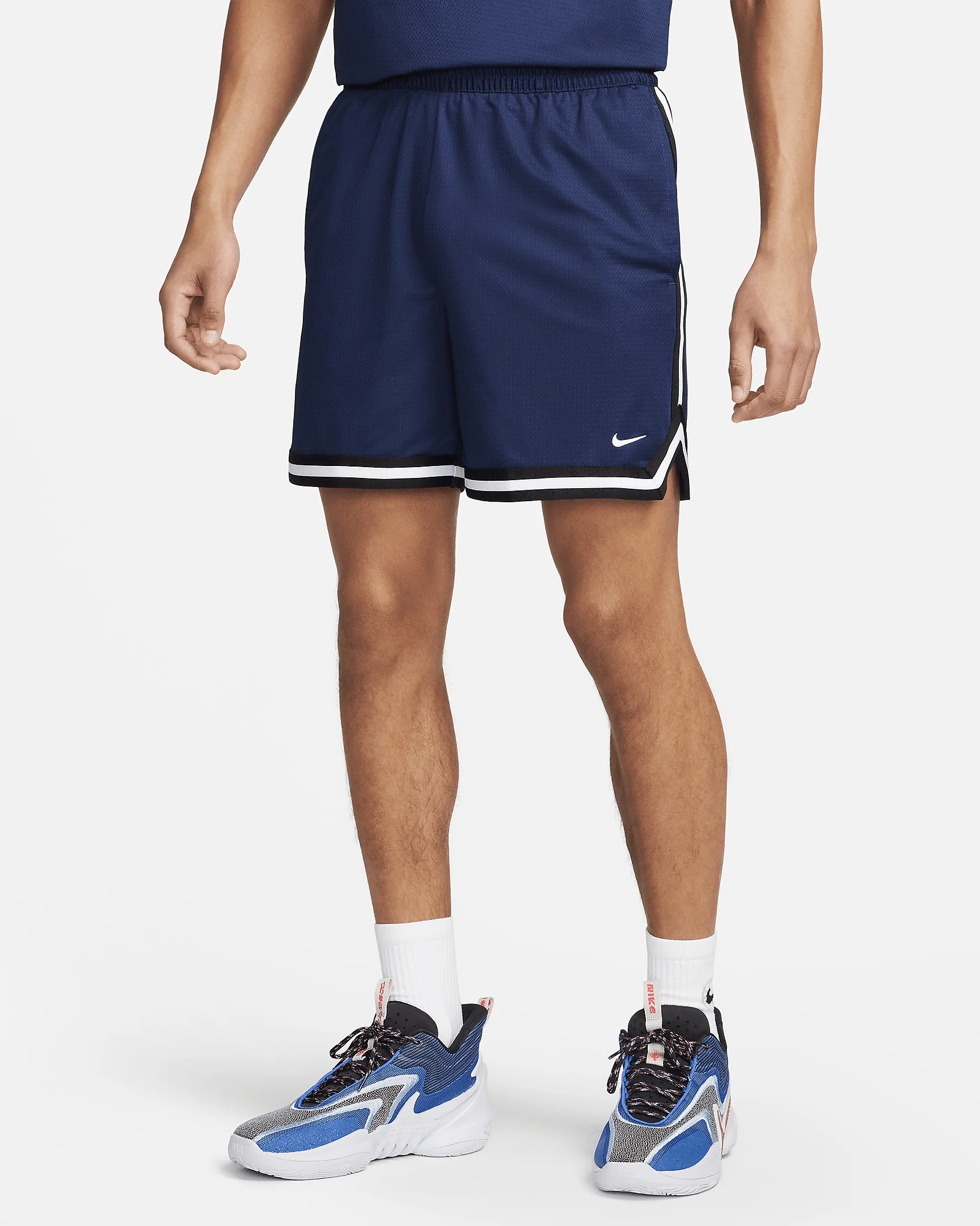 When the shot clock ticks down and the moment for a player to create their legend arrives, champions wear gear that helps them rise to the moment. The DNA Shorts help you stay ready to enter the spotlight with innovative fabrics and performance-driven designs. They're made with lightweight-yet-durable material that wicks sweat to keep you feeling dry and focused. They even offer a zippered pocket to keep your essentials secure whether you're on the court or off. Remember: champions stay ready. More Benefits - Designed for basketball - 6" inseam - Unlined - Lightweight, sweat-wicking fabric with mesh face and smooth interior - Side pockets and zippered utility pocket large enough for a phone - Elastic waistband with drawcord Product Details - Side vents - Embroidered Swoosh logo - 100% polyester - Machine wash - Imported - Not intended for use as Personal Protective Equipment (PPE) - Shown: Midnight Navy/Black/White - Style: FV4933-410 SIZE & FIT Model is wearing size M and is 6′2″188cm Big & Tall model is wearing size 3XL and is 6'5"196cm Standard fit: easy and traditional
