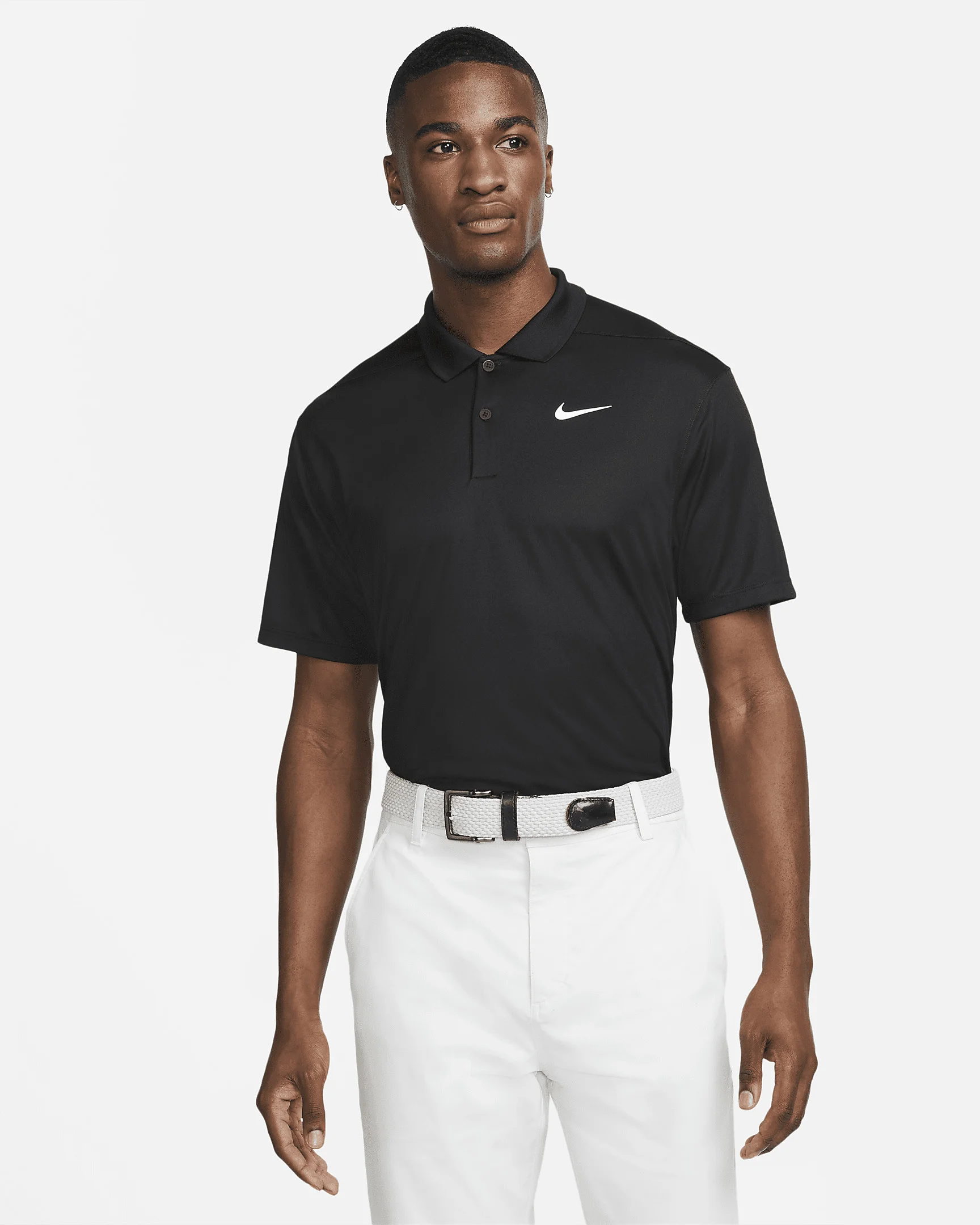 Crafted from breathable, sweat-wicking fabric, the Nike Dri-FIT Victory Polo puts a new spin on golf performance. This product is made with 100% recycled polyester fibers. Benefits - Nike Dri-FIT technology moves sweat away from your skin for quicker evaporation, helping you stay dry and comfortable. - Shoulder seams are rolled forward so you can fully power through your swing. - Collar is ribbed to help prevent curling. Product Details - Standard fit for a relaxed, easy feel - 2-button placket - 100% polyester - Machine wash - Imported - Shown: Black/White - Style: DH0822-010 SIZE & FIT Model is wearing size M and is 6'1"186cm Big & Tall model is wearing size 3XL and is 6'2"188cm Standard fit: easy and traditional