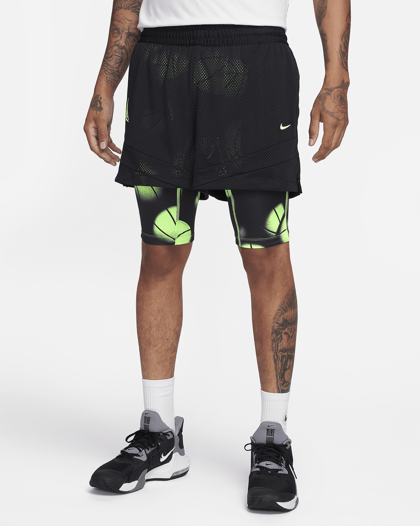 Ja Morant is a self-made superstar. Away from the spotlight, Ja grew up tirelessly working on his game on his backyard court in South Carolina. From anonymous to all-star, Nike celebrates his journey with this signature apparel collection. Our sweat-wicking 2-in-1 basketball shorts feature an open-hole mesh outer short and body-hugging liner short for support. The outer shorts are stamped with his signature logo, while the inner shorts feature a high-contrast basketball print. Product Details - Elastic waistband and drawcord - Body: 100% polyester. Tight: 90% polyester/10% spandex. Tight center front lining: 92% polyester/8% spandex. - Machine wash - Imported - Shown: Black/Lime Blast - Style: FQ1022-010 SIZE & FIT Model is wearing size M and is 6′1″185cm Standard fit: easy and traditional