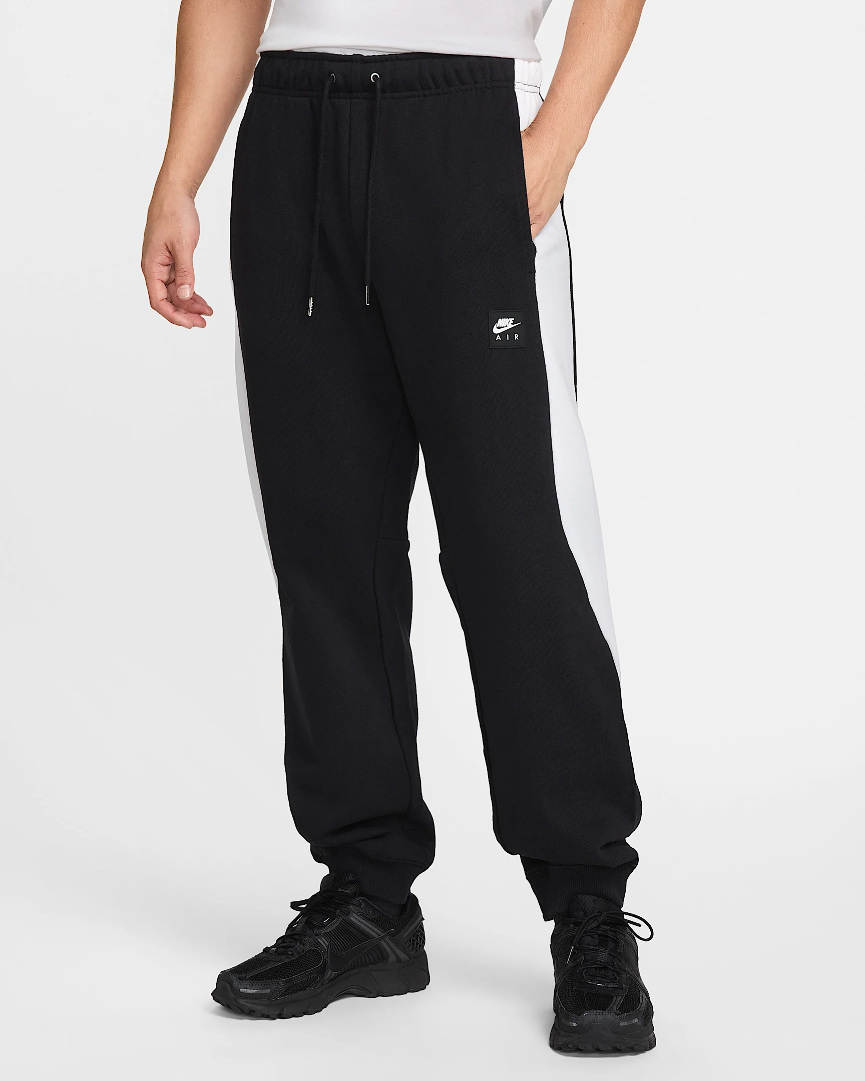 Not your typical sweats, these premium joggers are crafted with a heavyweight fleece that feels rugged and worn in from day one. Benefits - Designed to feel relaxed through the seat and thighs with a slight taper towards the ankle. - A vertical zippered back pocket pairs with side hand pockets for convenience. Product Details - Nike Air flag label and silicone patch - Elastic waistband with external drawcord - Body: 100% cotton. Rib: 96% cotton/4% spandex. - Machine wash - Imported - Shown: Black/White/Black - Style: HJ0291-010 SIZE & FIT Model is wearing size M and is 5′11″180cm Standard fit: easy and traditional 78 length: hits at ankle