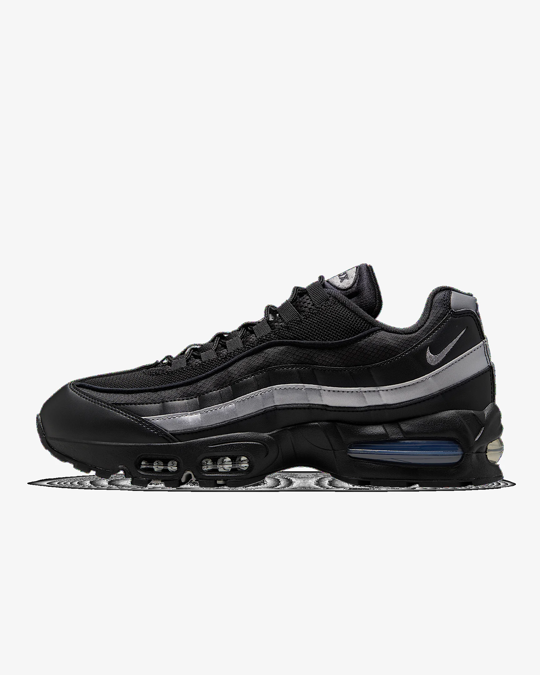 Taking inspiration from the human body and '90s track aesthetics, the Air Max 95 mixes unbelievable comfort with fast-paced style. The wavy side panels add natural flow to any outfit while visible cushioning in the heel and forefoot delivers performance comfort. Benefits - Upper combines real and synthetic leather with airy textiles for a layered look built to last. - Visible Max Air cushioning provides lightweight cushioning. - Flex grooves in the midsole/outsole let you move freely. - Inspired by the human anatomy, the midsole/outsole represent the spine, upper panels are the muscles and the laces are the shoe’s ribs. Product Details - Foam midsole - Rubber outsole - Shown: Black/Black/White/Metallic Silver - Style: IB1667-003