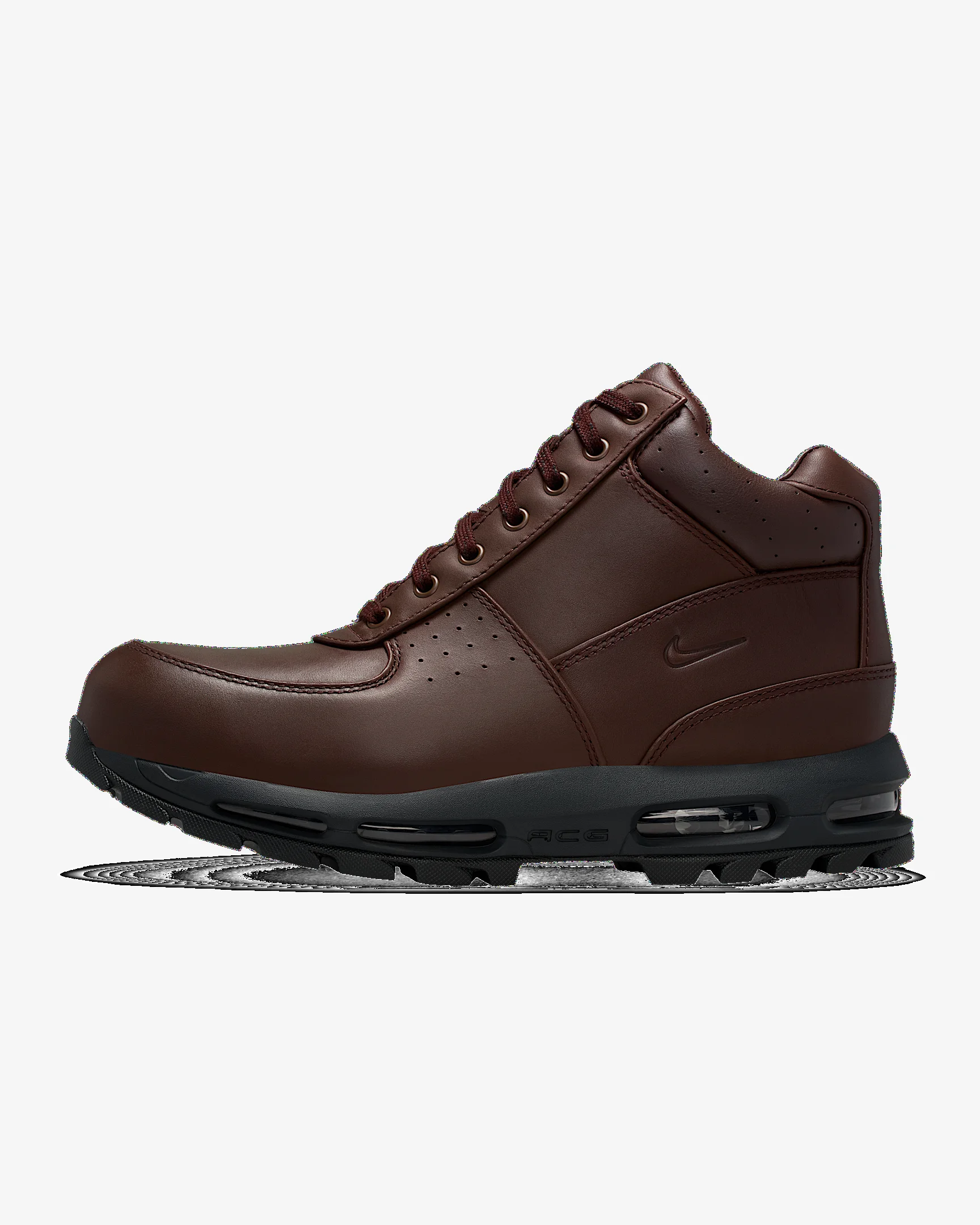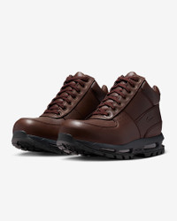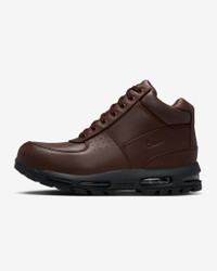 A classic boot tough enough for the mountains, yet sleek enough for the streets. Equipped with durable leather on top and rugged tread on the bottom, the Air Max Goadome is ready to take on the elements. Plus, the soft foam midsole and Air units help cushion your journey. Benefits - Perforated leather upper keeps it durable and breathable. - Padded, high-top collar provides stability around your ankle while keeping you warm. - Nike Air technology absorbs impact for cushioning with every step. - Rubber sole with aggressive lug pattern delivers traction with a rugged look. Product Details - Metal eyelets - ACG branding - Shown: Baroque Brown/Black/Off Noir/Baroque Brown - Style: IO7526-237