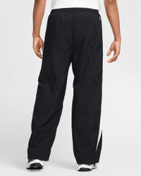 Dial up your casual attire with these premium track pants. The roomy, straight leg silhouette is crafted with a thick, water-resistant woven material. They're designed to feel roomy, with a straight leg and an open hem that rests on your shoes. Benefits - An interior mesh lining adds breathable comfort. - Storage options include a vertical zippered back pocket and side hand pockets. Product Details - Nike Air logo Silicone patch - Elastic waistband with external drawcord - Metal grommets and drawcord tips - Body: 100% nylon. Mesh: 100% polyester. Lining: 100% polyester. - Machine wash - Imported - Shown: Black/White/White - Style: HJ0285-010 SIZE & FIT Model is wearing size M and is 6′2″188cm Loose fit: roomy and relaxed