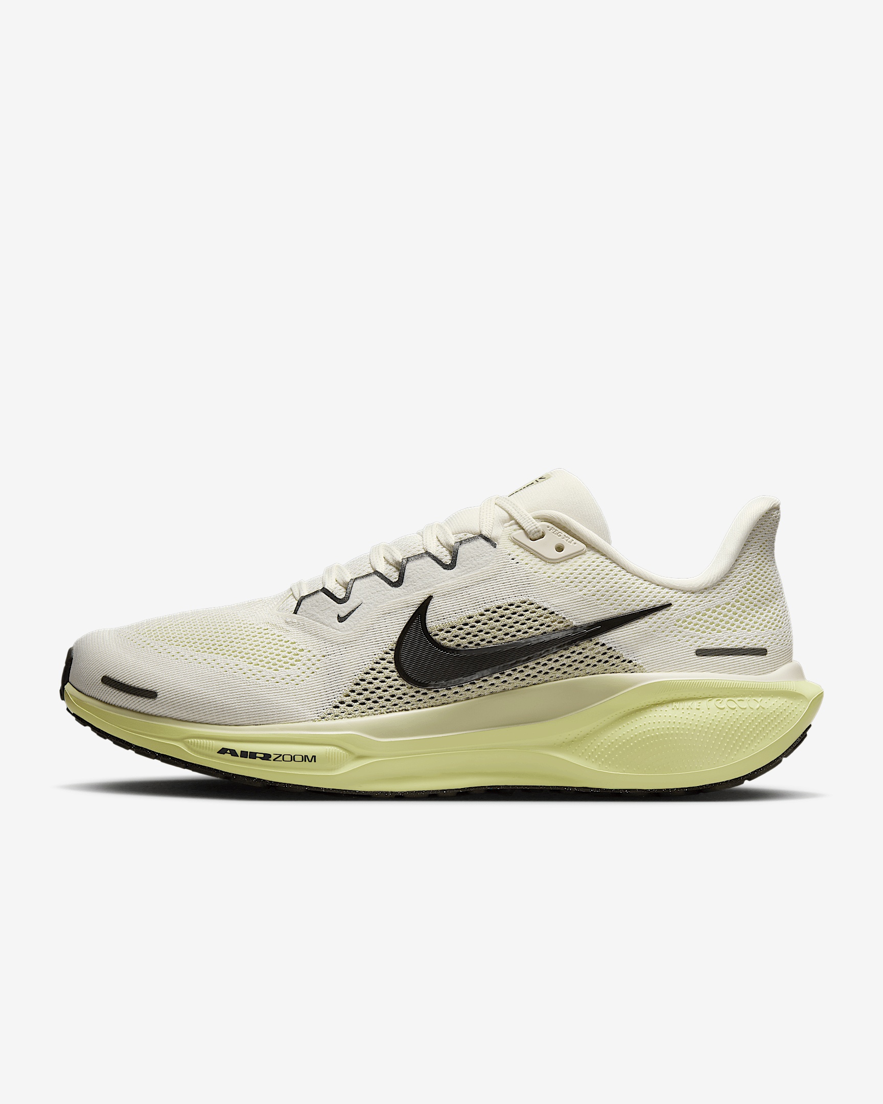 Responsive cushioning in the Pegasus provides an energized ride for everyday road running. Experience lighter-weight energy return with dual Air Zoom units and a ReactX foam midsole. Plus, improved engineered mesh on the upper decreases weight and increases breathability. Benefits - Upgraded breathable engineered mesh upper - ReactX foam midsole surrounds forefoot and heel Air Zoom units for an energized ride. - Signature waffle-inspired rubber outsole for traction and flexibility - Plush collar tongue and sockliner for a secure and comfortable fit - What's new? All-new ReactX foam midsole is 13% more responsive than previous React technology. - Crafted for performance and planet, ReactX foam is engineered to reduce its carbon footprint by at least 43% in a pair of midsoles due to reduced manufacturing process energy compared to prior React foam. The carbon footprint of ReactX is based on cradle-to-gate assessment reviewed by PRe Sustainability B.V and Intertek China. Other midsole components such as airbags, plates or other foam formulations were not considered. Product Details - Weight: Approx. 297 g/10.4 oz (Men's US 10) - Heel-to-toe drop: 10 mm - MR-10 Last - Our best, most consistent fit (same as Pegasus 40) - Not intended for use as Personal Protective Equipment (PPE) - Shown: Pale Ivory/Limelight/Olive Aura/Sequoia - Style: FD2722-109