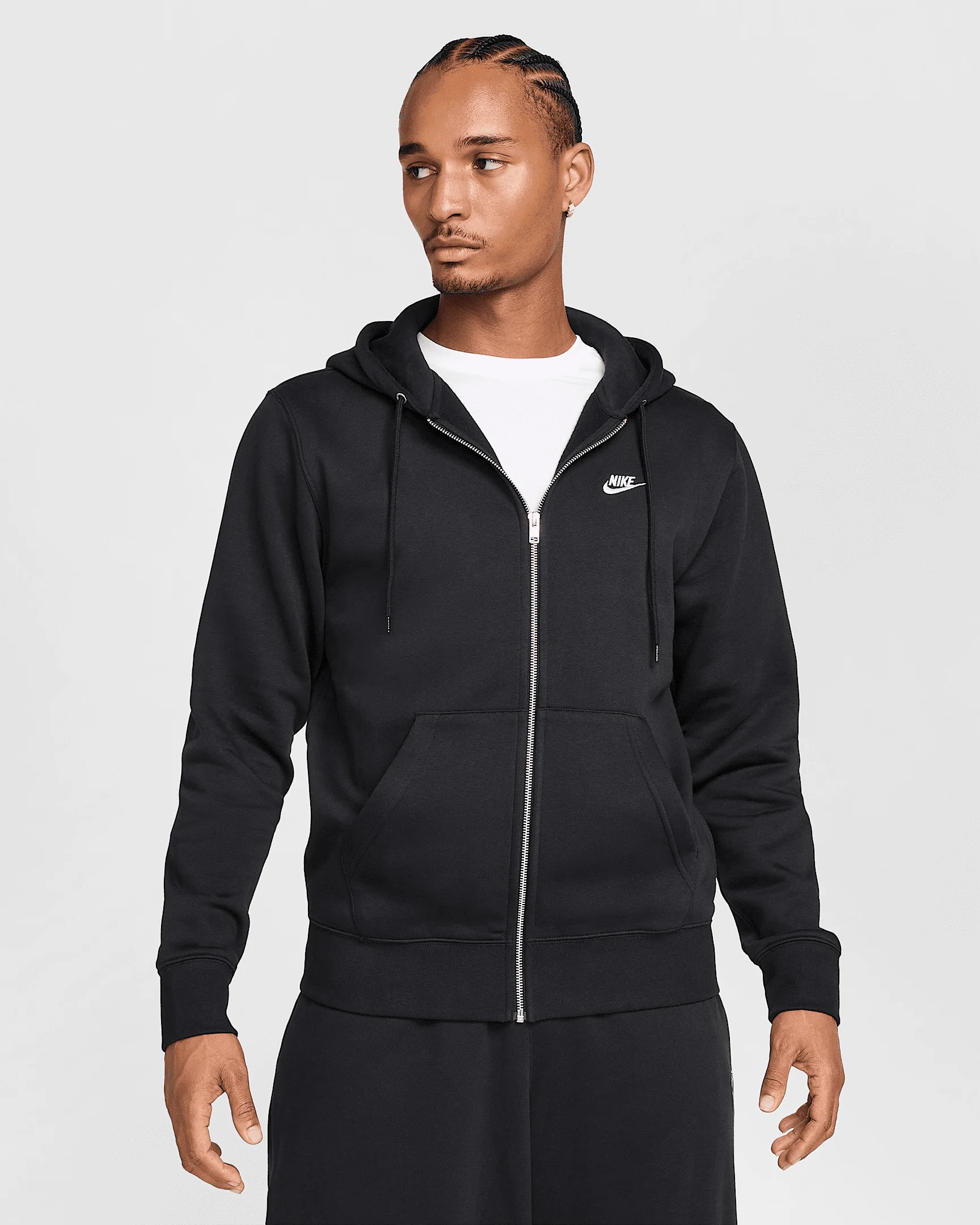 Clean meets casual with this classic hoodie. Smooth on the outside, super soft on the inside, this brushed fleece sweatshirt delivers comfort you can count on. Benefits - Our midweight brushed fleece feels extra soft on the inside and smooth on the outside, helping you stay cozy while keeping its structured shape. - The standard fit is designed to feel relaxed through the body for easy layering. - Double-layer hood has a round braided drawcord to make finding the right fit a cinch. Product Details - Embroidered Nike Futura Logo - Divided pouch pocket - Ribbed hem and cuffs - Metal Zipper - Body: 67-80% cotton/20-33% polyester. Hood lining: 67-80% cotton/20-33% polyester. - Material percentages may vary. Check label for actual content. - Machine wash - Imported - Shown: Black/Black/White - Style: FN3861-010 SIZE & FIT Model is wearing size M and is 6′2″188cm Big & Tall model is wearing size 3XL and is 6'5"196cm Standard fit: easy and traditional