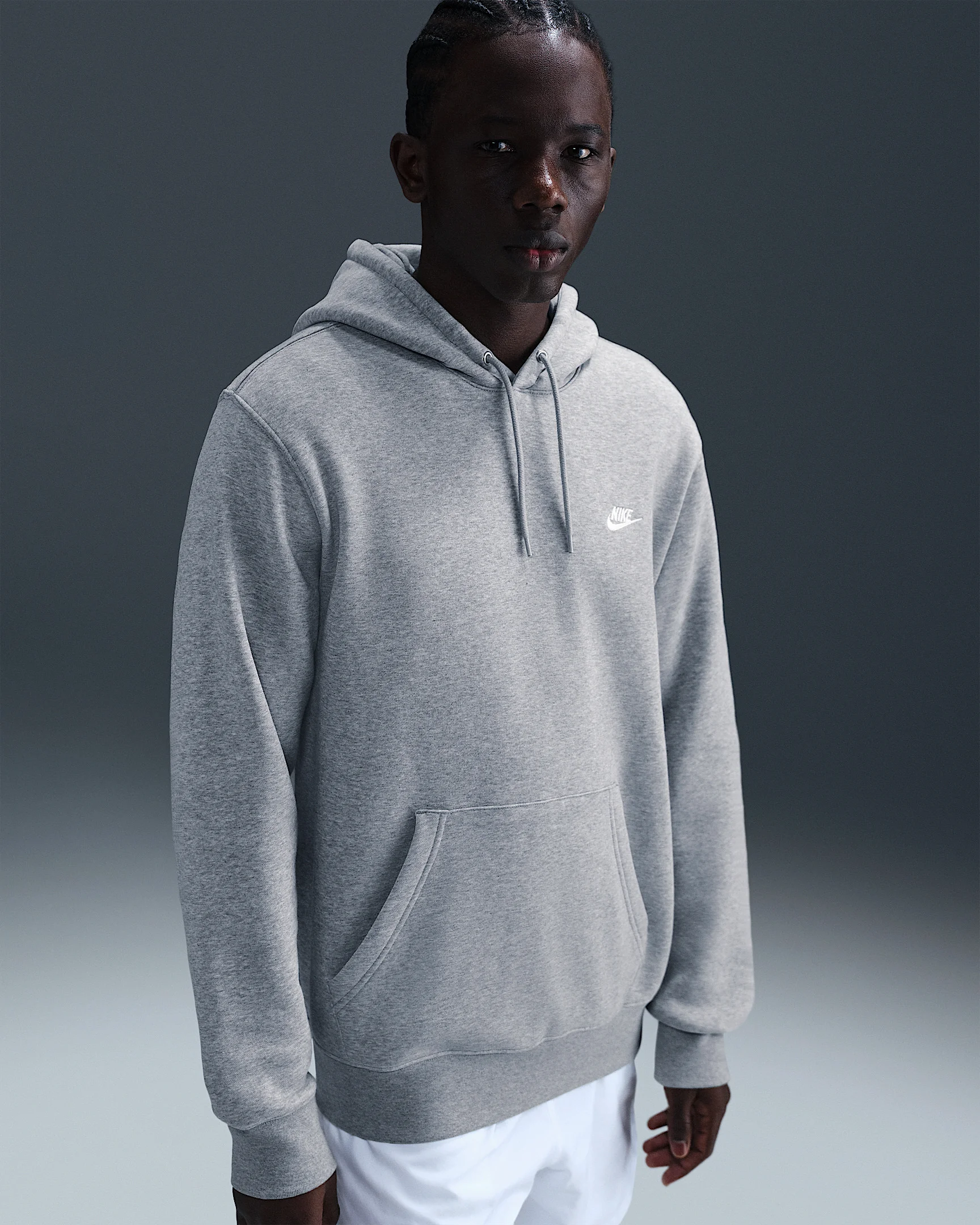 Clean meets casual with this classic hoodie. Our midweight brushed fleece feels extra soft on the inside and smooth on the outside, helping you stay cozy while keeping its structured shape. Product Details - Embroidered Nike Futura Logo - Double-layer hood - Round braided drawcords - Pouch Pocket - Ribbed hem and cuffs - Body: 67-81% cotton/19-33% polyester. Hood lining: 67-81% cotton/19-33% polyester. - Material percentages may vary. Check label for actual content. - Machine wash - Imported - Shown: Dark Grey Heather/Light Smoke Grey/White - Style: FN3859-063 SIZE & FIT Model is wearing size M and is 6′1″185cm Big & Tall model is wearing size 3XL and is 6'6"198cm Standard fit: easy and traditional
