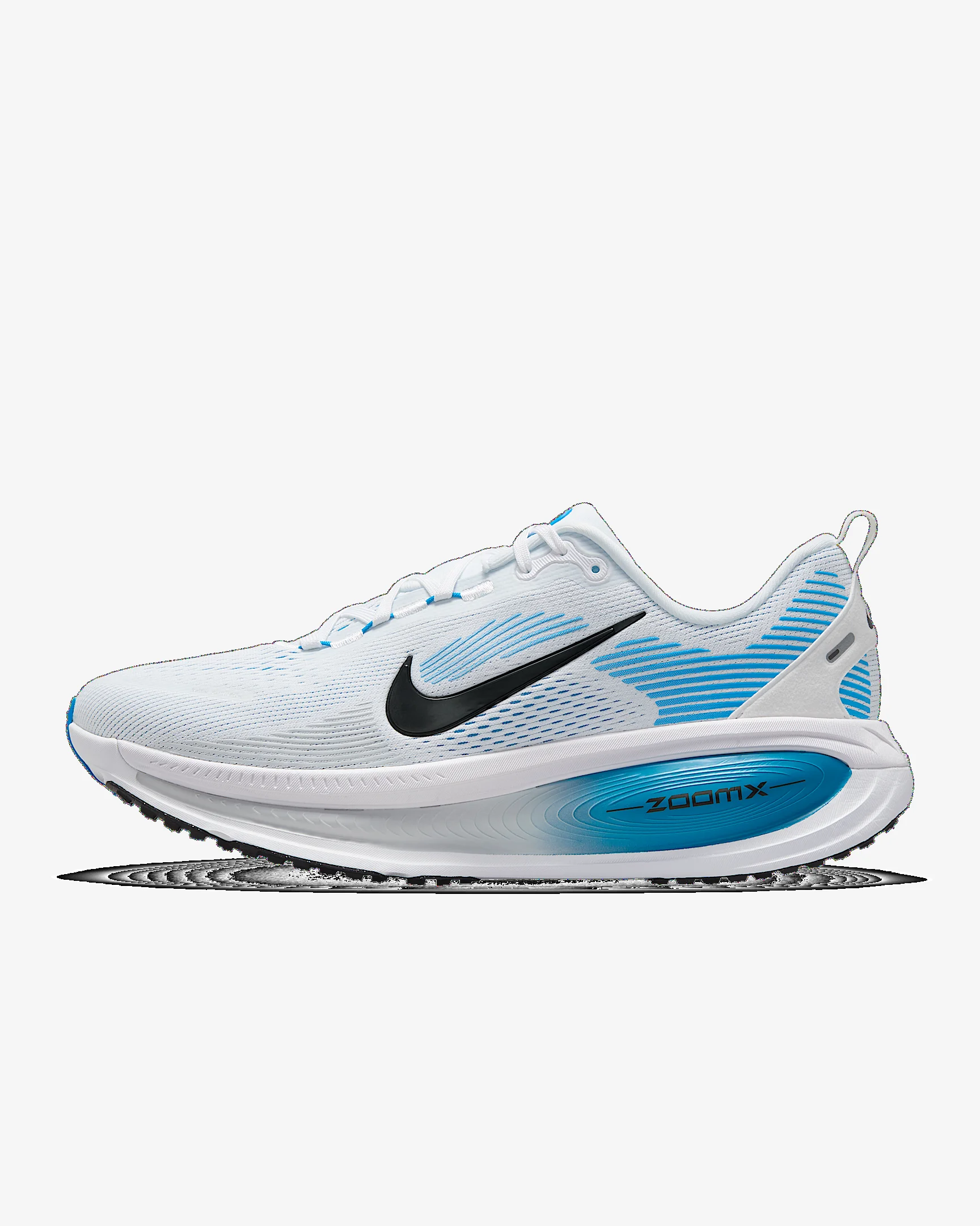 Maximum cushioning in the Vomero provides a comfortable ride for everyday runs. Our softest, most cushioned ride has lightweight ZoomX foam stacked on top of responsive ReactX foam in the midsole. Plus, a redesigned traction pattern offers a smooth heel-to-toe transition. Product Details - Weight: Approx. 325g/11.5oz (Men's US 10) - Heel-to-toe drop: 10mm - MR-10 Last - Our best, most consistent fit - Reflective details - Not intended for use as Personal Protective Equipment (PPE) - Shown: White/Blue Hero/Black - Style: HM6803-109