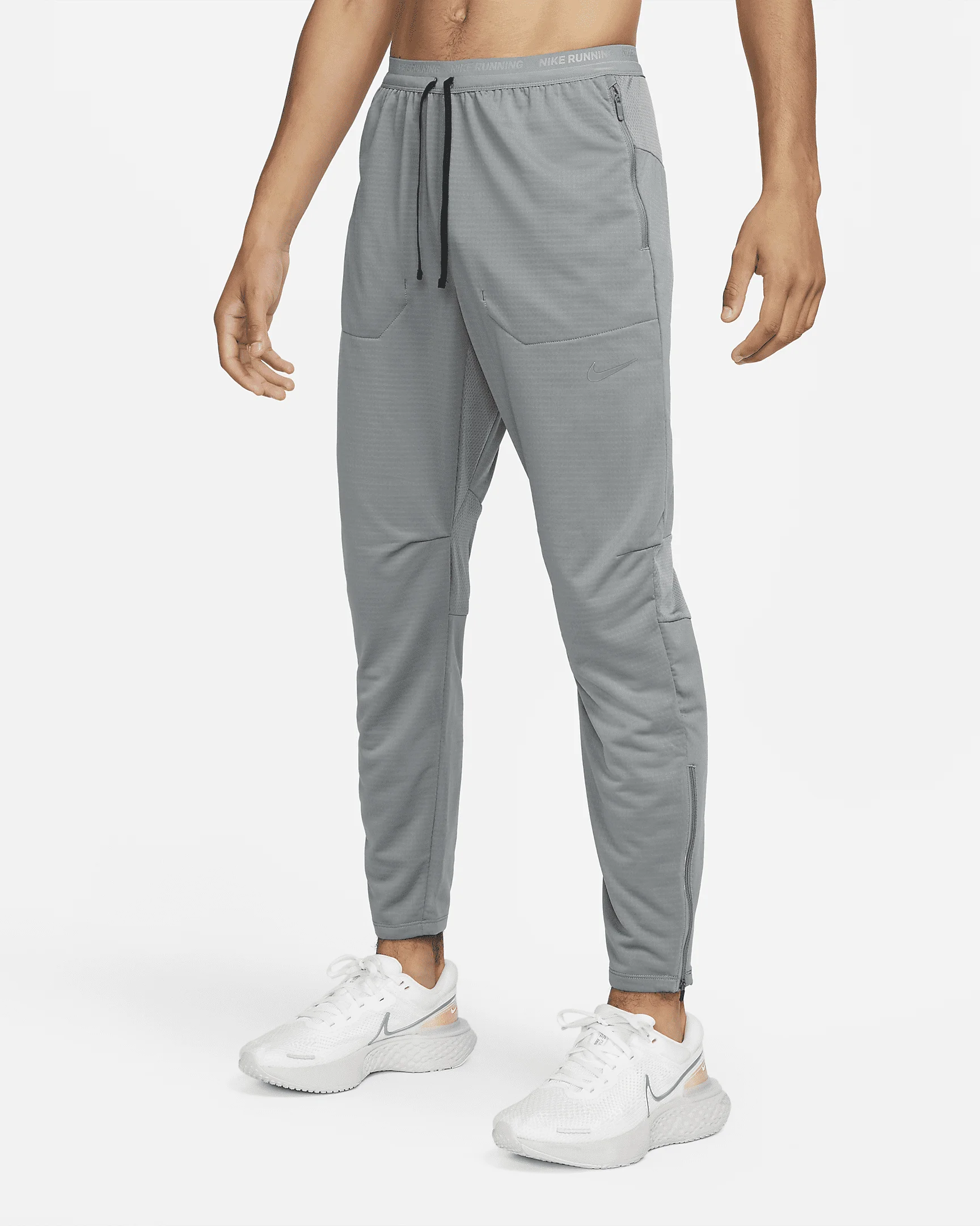 Step out in our lightweight Phenom Pants. We know you're out there giving your all, so we keep you feeling comfortable with buttery smooth, sweat-wicking fabric. Plus, there's pockets for your phone, keys or anything else you need. This product is made with at least 75% recycled polyester fibers. Benefits - Nike Dri-FIT technology moves sweat away from your skin for quicker evaporation, helping you stay dry and comfortable. - Knit fabric has a smooth sensation. - A zippered back pocket with sweat-proof lining is large enough to hold your phone. - Zippered side pockets help secure small items - At the right pocket, a mesh inner pocket can hold a key or card. - Mesh at the upper back, back of the knees, ankles and inseam panel feels breathable and airy. - Zippered leg hems provide easy on and off over your shoes. Product Details - Reflective tape and graphics - Standard fit for a relaxed, easy feel - "Nike Running" elastic waistband with drawcord - Zippered side pockets - 100% polyester - Machine wash - Imported - Not intended for use as Personal Protective Equipment (PPE) - Shown: Smoke Grey - Style: DQ4740-084 SIZE & FIT Model is wearing size M and is 6′3″189cm Standard fit: easy and traditional