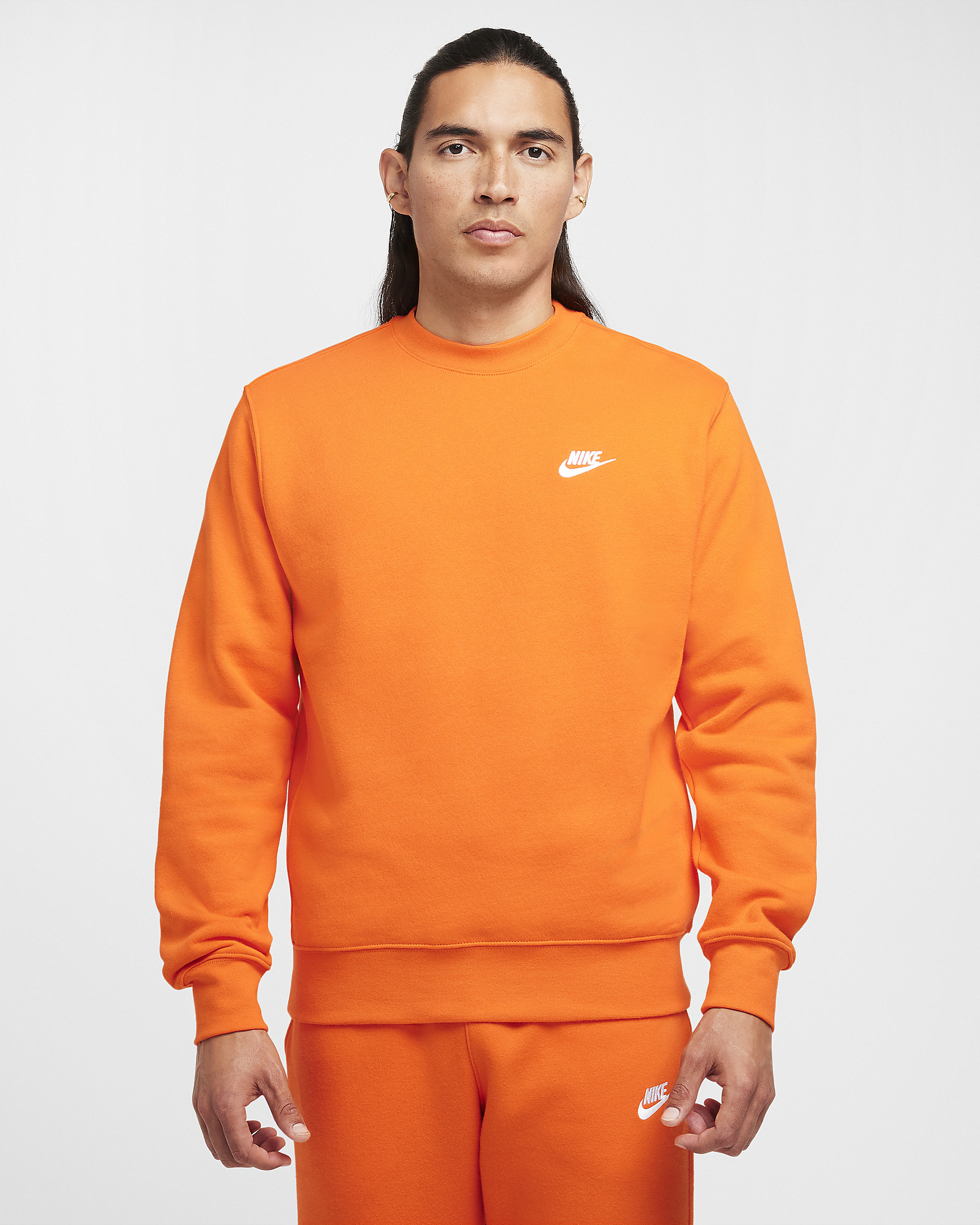 A closet staple, the Nike Sportswear Club Fleece Crew combines a classic embroidered logo on the left chest with the soft comfort of fleece for an elevated everyday look. Product Details - Standard fit for a relaxed, easy feel - Fabric: 80-82% cotton/18-20% polyester - Machine wash - Imported - Note: Material percentages may vary depending on factory. Check label for actual content. - Shown: Safety Orange/White - Style: BV2662-819 SIZE & FIT Model is wearing size M and is 6′0″183cm Standard fit: easy and traditional