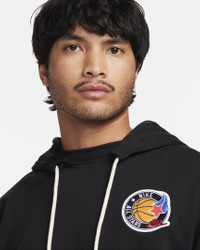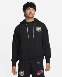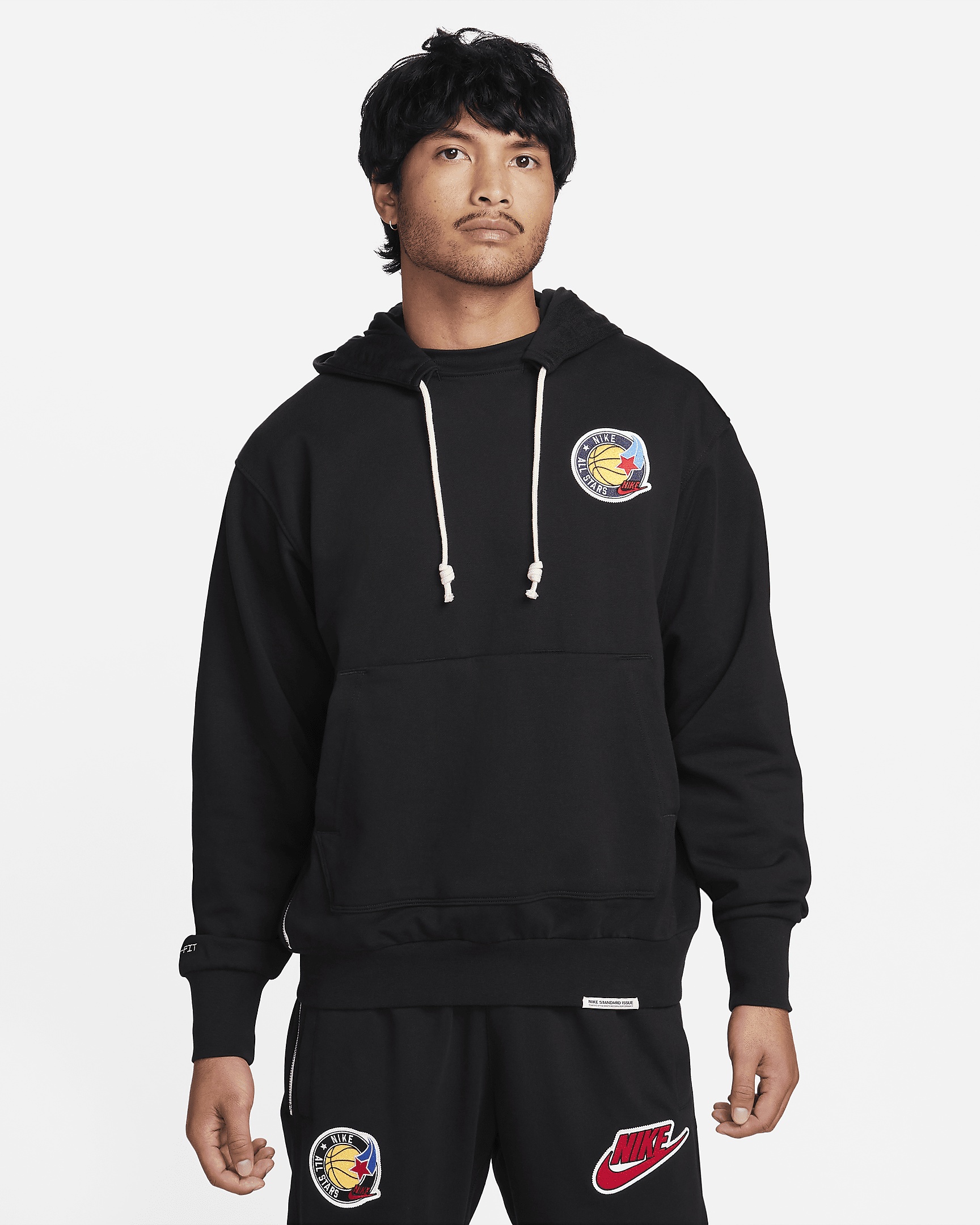 Warm up like an all star in this Standard Issue hoodie. Made with a roomy fit and sweat-wicking, heavyweight French terry, it's a pullover with a performance-ready feel, but it's made to help you stay comfortable beyond the court. Benefits - Nike Dri-FIT technology moves sweat away from your skin for quicker evaporation, helping you stay dry and comfortable. - Zippered pocket at right side is large enough to store most phones. - Ribbed cuffs, neckband and hem help keep the hoodie in place while you move. Product Details - Front pocket - Embroidered details - Woven Standard Issue label - Body: 61% cotton/39% polyester. Rib: 97% cotton/3% spandex. Hood lining: 100% cotton. - Machine wash - Imported - Shown: Black - Style: HF4470-010 SIZE & FIT Model is wearing size M and is 6′0″183cm Loose fit: roomy and relaxed