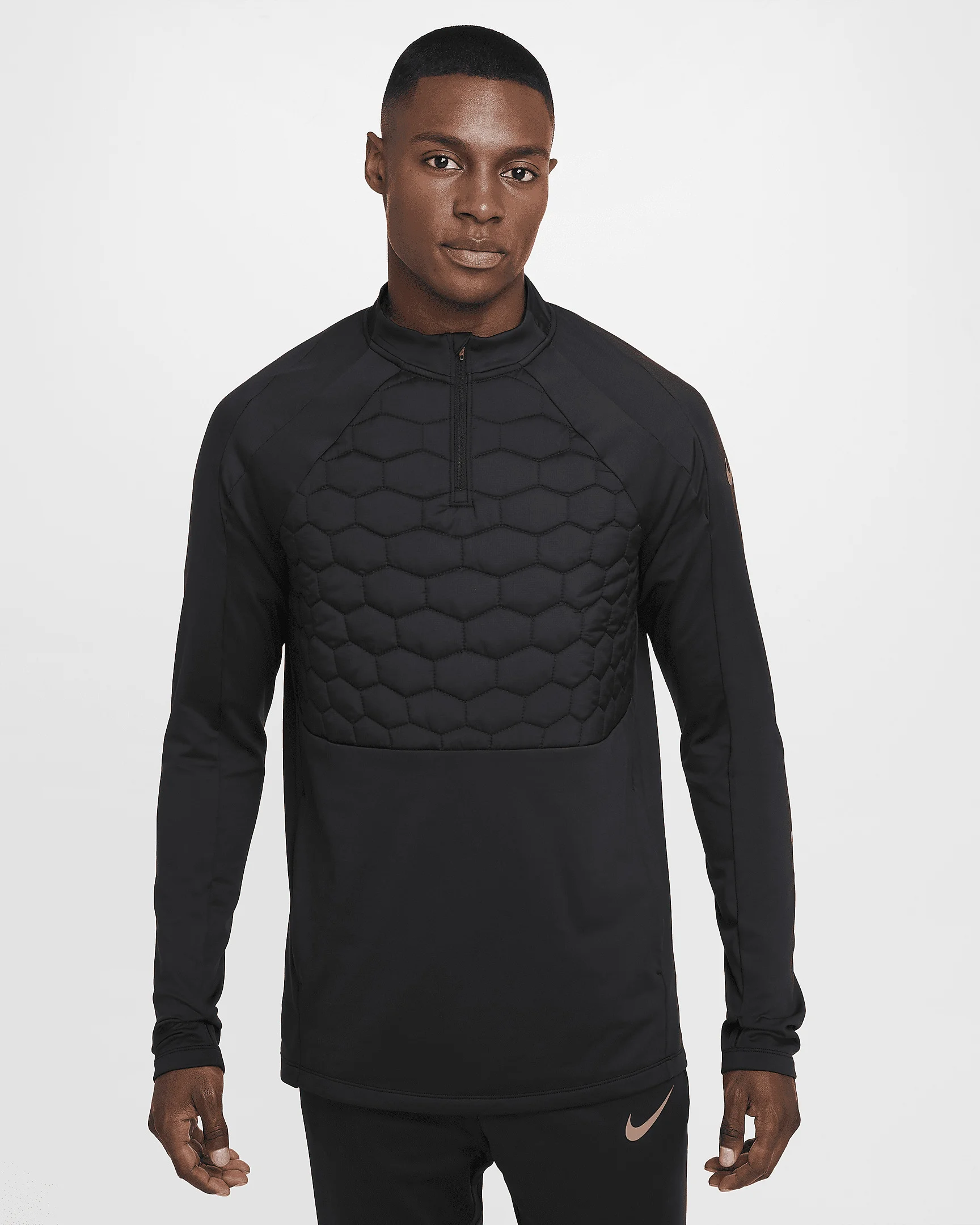 With design details specifically tailored for soccer's rising stars, this Strike drill top is made to stand up to cold and unpredictable weather. It's updated with high-stretch, brushed fabric and insulated chest panels to help you stay extra warm on the field. Panels at the shoulders and chest repel water. Benefits - Nike Therma-FIT technology helps manage your body’s natural heat to help keep you warm in cold-weather conditions. - Lightweight insulation on the chest provides extra warmth. - 1/4-zip design makes changing easy. - Zippered pockets help keep your essentials secure. - Thumbholes let you extend your coverage and help hold the sleeves in place while you move. Product Details - Reflective elements - Body/Panels lining: 92% polyester/8% spandex. Panels/Panels fill: 100% polyester. - Machine wash - Imported - Not intended for use as Personal Protective Equipment (PPE) - Shown: Black - Style: FZ0566-010 SIZE & FIT Model is wearing size M and is 6′0″183cm Sm fit: sleek and tailored