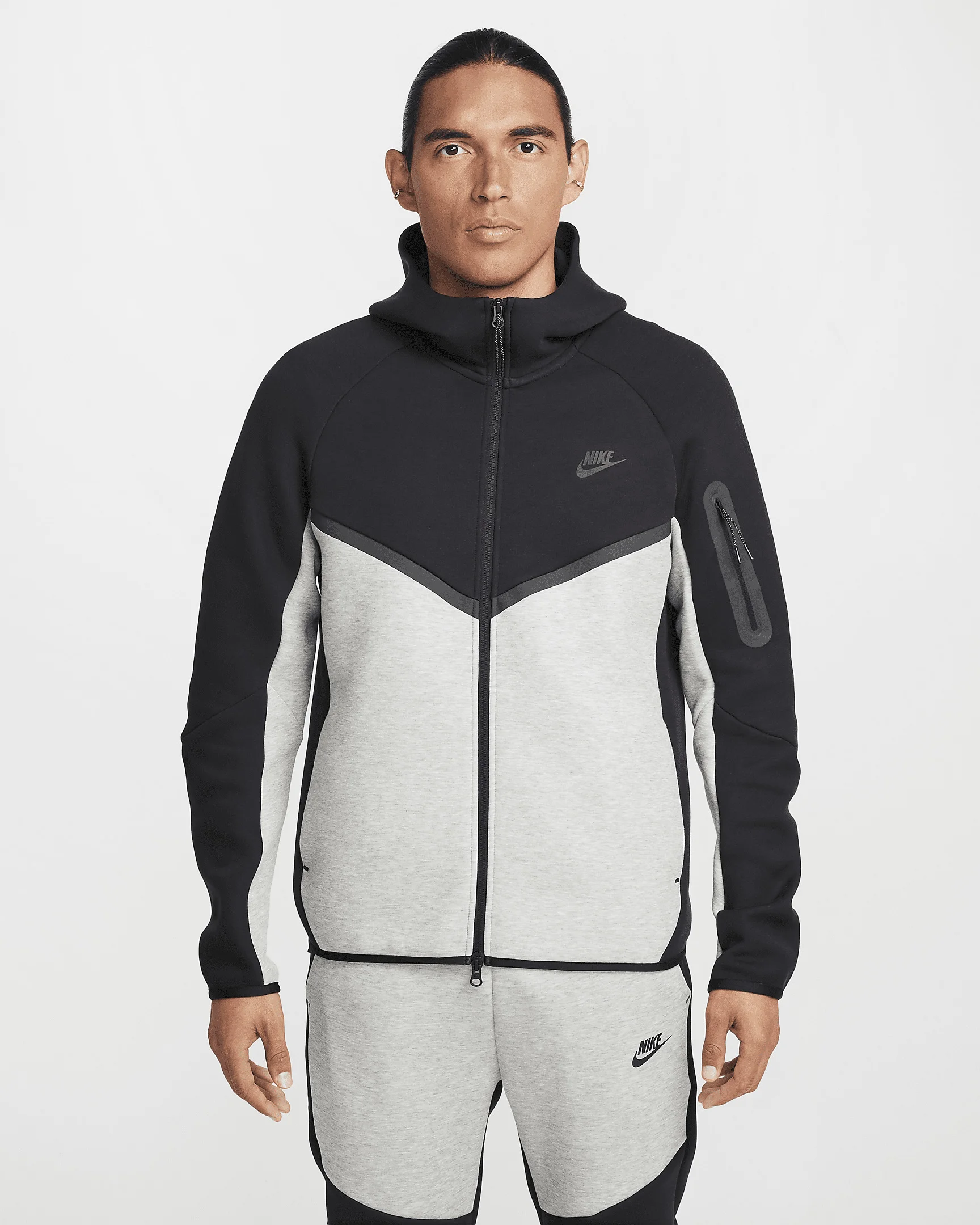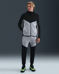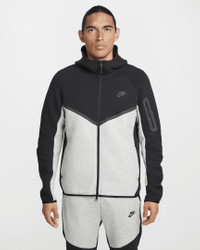 The iconic Tech Fleece Windrunner Hoodie is back. This version has the utility sleeve pocket, hem and cuff binding, and taped chevron that made the original stand out in the streets. Benefits - Our premium, smooth-on-both-sides fleece feels warmer and softer than ever, while keeping the same lightweight build you love. - The standard fit is designed to feel relaxed through the body for easy layering. Product Details - Hand pockets - Zippered sleeve pocket - Body: 53% cotton/47% polyester. Pocket Bag Knuckle Side: 100% cotton. Hood Lining: 53% cotton/47% polyester. - Machine wash - Imported - Shown: Black/Dark Grey Heather/Black - Style: HV0949-011 SIZE & FIT Model is wearing size M and is 6′0″183cm Big & Tall model is wearing size 3XL and is 6'5"196cm Standard fit: easy and traditional