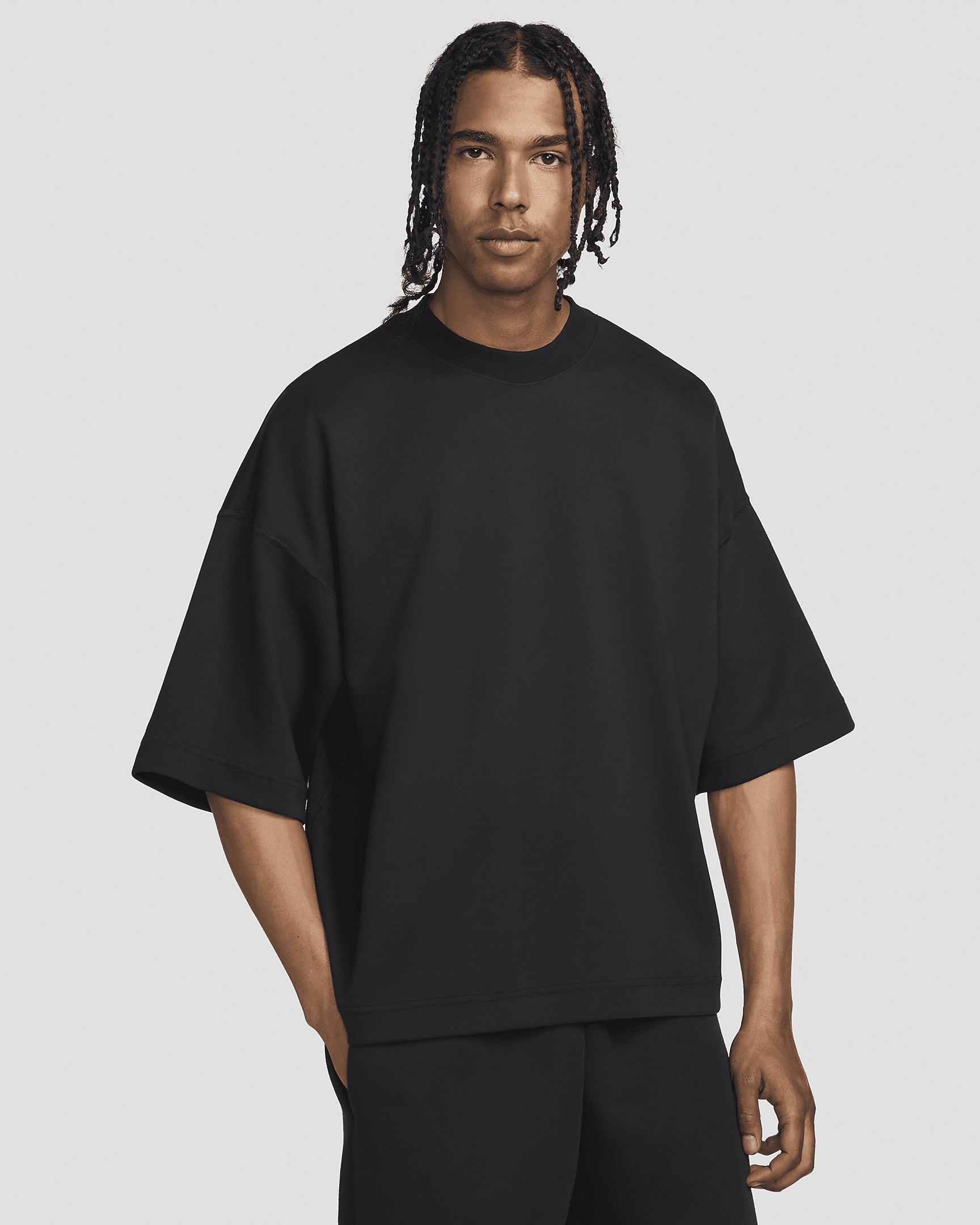 This spacious top is built with our premium, lightweight fleece–smooth both inside and out–to give you plenty of warmth without adding bulk. The oversized look fits slightly longer with plenty of space through the body. Product Details - Embroidered Nike Futura logo - Signature back neck tape - 82% cotton/18% polyester - Machine wash cold - Imported - Shown: Black/Black - Style: FZ7581-010 SIZE & FIT Model is wearing size M and is 6′2″188cm Oversized fit: exaggerated and spacious