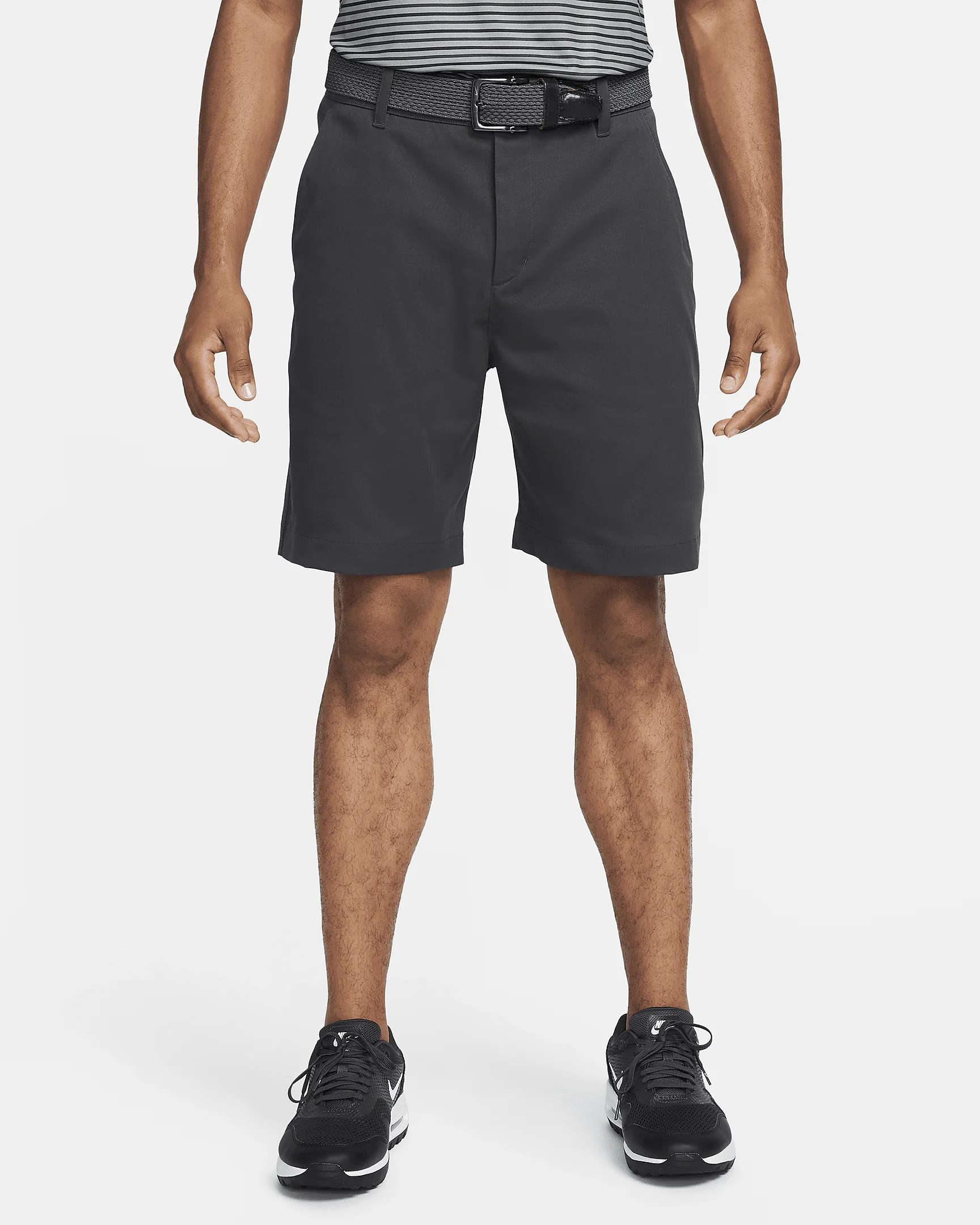 From driving range to course to clubhouse, do it all in the Nike Tour Chino Golf Shorts. Cut with a relaxed and streamlined fit, they help you feel confident through each swing with stretchy, sweat-wicking woven fabric. Got a scorecard, yardage book and tees? There's plenty of pockets for your essentials. Benefits - Stretch-woven fabric helps you get the most out of your swing. - Water-repellent finish helps keep you dry in wet weather. - Elastic waistband with a snap-hook-and-bar closure provides a snug fit. - Mesh-lined pockets hold your golf essentials like a scorecard, pen and yardage book. Product Details - 8" inseam - Body and pocket bags: 100% polyester. - Machine wash - Imported - Shown: Dark Smoke Grey/Black - Style: FD5721-070 SIZE & FIT Model is wearing size 32 and is 5′11″180cm Standard fit: easy and traditional Fits small; we recommend ordering a size up
