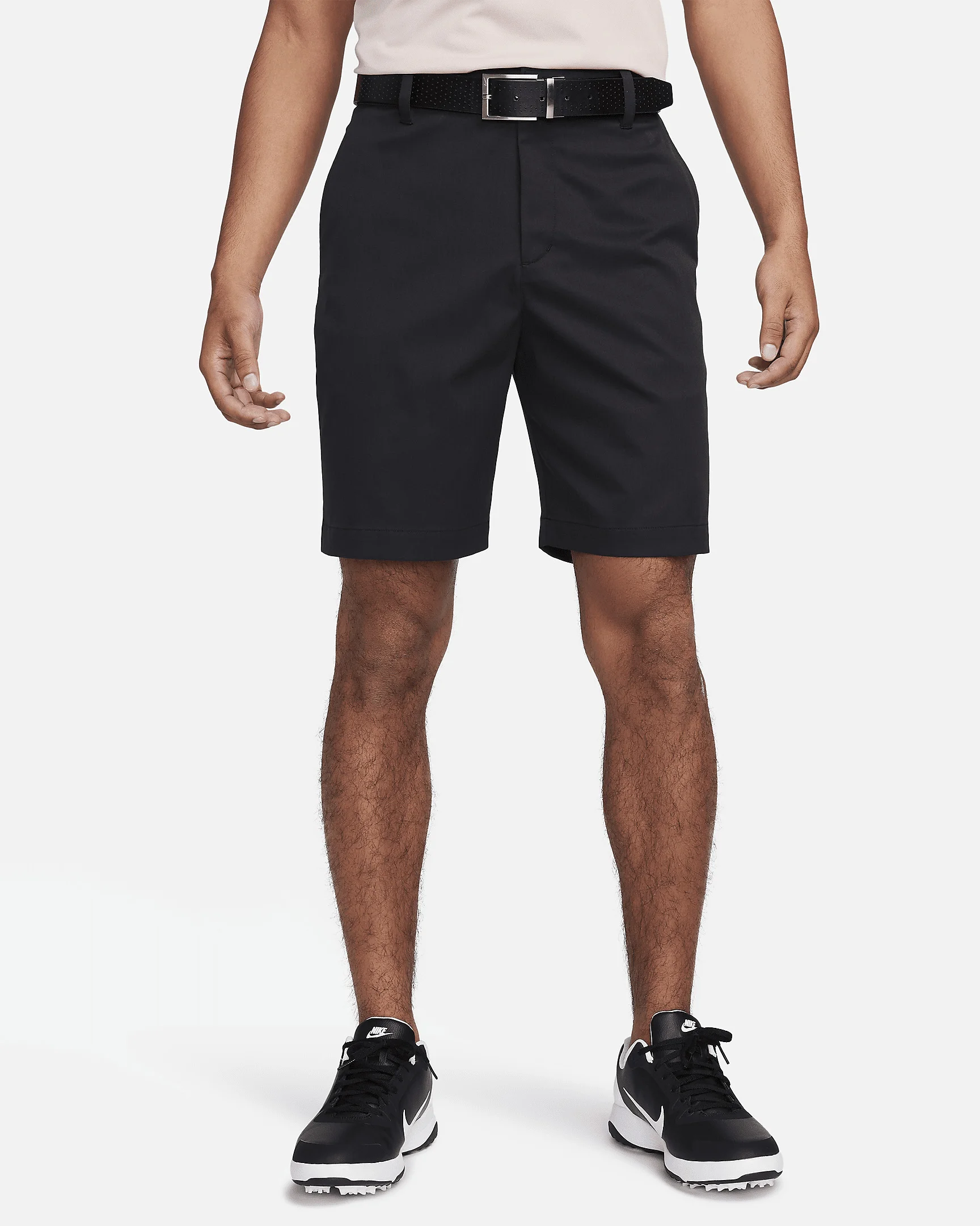 From driving range to course to clubhouse, do it all in the Nike Tour Chino Golf Shorts. Cut with a relaxed and streamlined fit, they help you feel confident through each swing with stretchy, sweat-wicking woven fabric. Got a scorecard, yardage book and tees? There's plenty of pockets for your essentials. Benefits - Stretch-woven fabric helps you get the most out of your swing. - Water-repellent finish helps keep you dry in wet weather. - Elastic waistband with a snap-hook-and-bar closure provides a snug fit. - Mesh-lined pockets hold your golf essentials like a scorecard, pen and yardage book. Product Details - 8" inseam - Body and pocket bags: 100% polyester. - Machine wash - Imported - Shown: Black/Black - Style: FD5721-010 SIZE & FIT Model is wearing size 32 and is 6′0″183cm Big & Tall model is wearing size 42 and is 6'3"189cm Standard fit: easy and traditional Fits small; we recommend ordering a size up