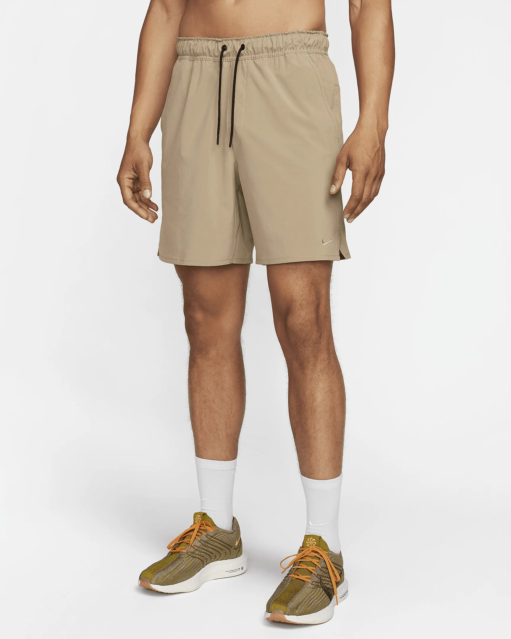 Built for running, training and yoga, our Unlimited collection helps keep you moving throughout the year, thanks to its premium materials and innovative features. These shorts are here for whatever your workout requires, with stretchy fabric that won't get in the way of movement. Plus, a hidden pocket lets you keep your phone close as you bring the heat to the gym or a run. More Benefits - Designed for Running, Yoga and Training - Length: 7" - Liner: Unlined - Fabric: 4-way stretch woven - Storage: Side pockets and hidden back pocket - Waistband: Stay-in-place waistband with convertible interior/exterior drawcord Product Details - Interior key loop - Faux fly - Embroidered Swoosh - Body: 86% polyester/14% spandex. Mesh: 100% polyester. - Machine wash - Imported - Shown: Khaki/Black/Khaki - Style: DV9340-247 SIZE & FIT Model is wearing size M and is 6′2″188cm Big & Tall model is wearing size 2XL and is 6'3"189cm Standard fit: easy and traditional Fits large; we recommend ordering a size down