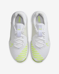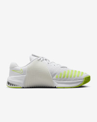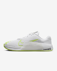 Whatever your "why" is for working out, the Metcon 9 makes it all worth it. We improved on the 8 with a larger Hyperlift plate and added rubber rope wrap. Sworn by some of the greatest athletes in the world, intended for lifters, cross trainers, go-getters and it’s still the gold standard that delivers day after day. More Benefits - Full rubber outsole provides durable traction for dynamic movements like cleans and walking lunges. - Breathable textile has a haptic print, which creates a 3-D effect that adds durability and texture, helping make it easier to keep your shoes clean. Also, it sports flexible, durable support in the toe area, so that when your toes splay when lifting heavy weights, it won’t feel restrictive. Product Details - Shown: White/White/Volt - Style: DZ2617-104