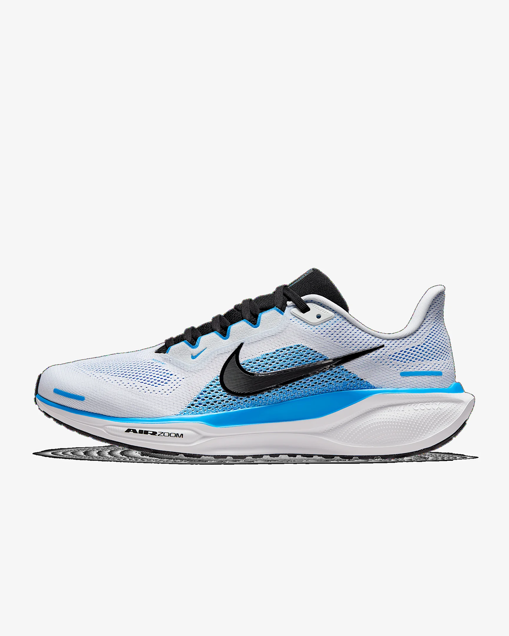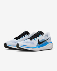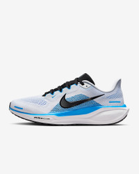 Responsive cushioning in the Pegasus provides an energized ride for everyday road running. Experience lighter-weight energy return with dual Air Zoom units and a ReactX foam midsole. Plus, improved engineered mesh on the upper decreases weight and increases breathability. More Benefits - ReactX foam midsole - Lighter, more breathable engineered mesh upper Product Details - Weight: Approx. 297g/10.5oz (Men's US 10) - Heel-to-toe drop: 10mm - MR-10 Last - Our best, most consistent fit (same as Pegasus 40) - Reflective details - Not intended for use as Personal Protective Equipment (PPE) - Shown: White/Blue Hero/Black - Style: FD2722-119