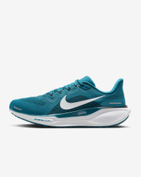 Responsive cushioning in the Pegasus provides an energized ride for everyday road running. Experience lighter-weight energy return with dual Air Zoom units and a ReactX foam midsole. Plus, improved engineered mesh on the upper decreases weight and increases breathability. Benefits - Upgraded breathable engineered mesh upper - ReactX foam midsole surrounds forefoot and heel Air Zoom units for an energized ride. - Signature waffle-inspired rubber outsole for traction and flexibility - Plush collar tongue and sockliner for a secure and comfortable fit - What's new? All-new ReactX foam midsole is 13% more responsive than previous React technology. - Crafted for performance and planet, ReactX foam is engineered to reduce its carbon footprint by at least 43% in a pair of midsoles due to reduced manufacturing process energy compared to prior React foam. The carbon footprint of ReactX is based on cradle-to-gate assessment reviewed by PRe Sustainability B.V and Intertek China. Other midsole components such as airbags, plates or other foam formulations were not considered. Product Details - Weight: Approx. 297 g/10.4 oz (Men's US 10) - Heel-to-toe drop: 10 mm - MR-10 Last - Our best, most consistent fit (same as Pegasus 40) - Not intended for use as Personal Protective Equipment (PPE) - Shown: Blustery/White/Black/White - Style: FZ5085-400