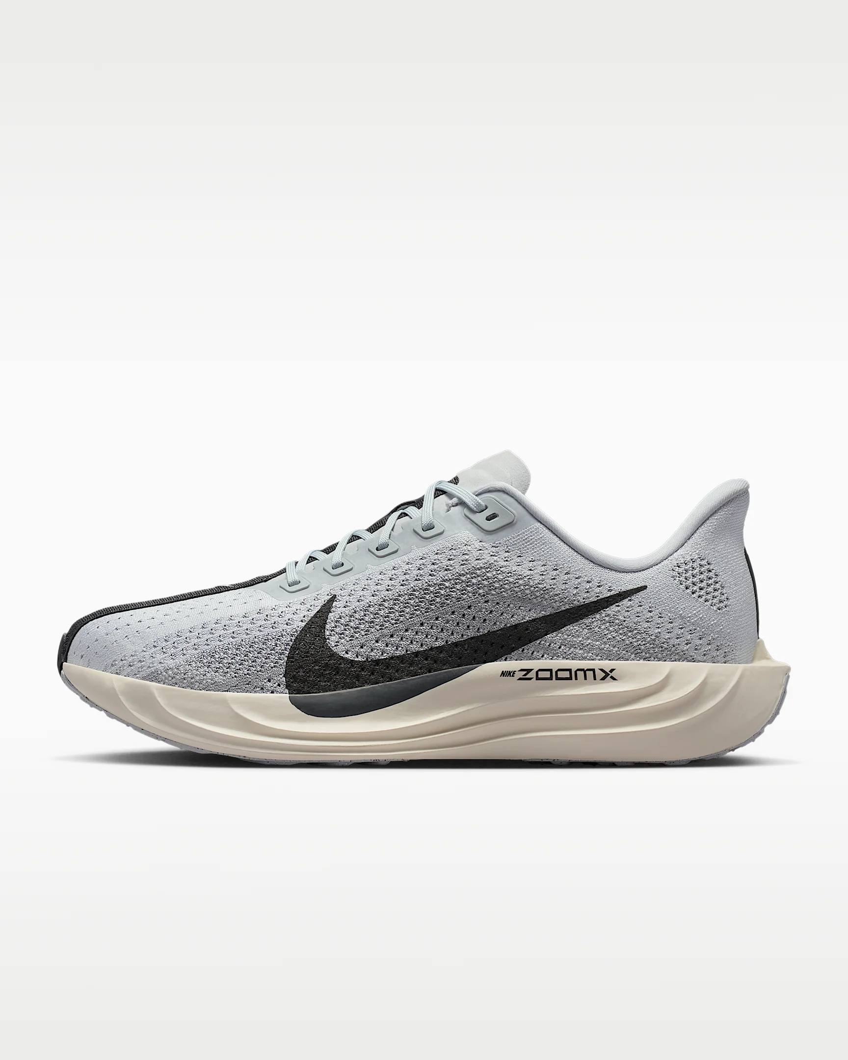 Take responsive cushioning to the next level with the Pegasus Plus. It energizes your ride with full-length, superlight ZoomX foam to give you a high level of energy return for everyday runs. And a stretchy Flyknit upper conforms to your foot for a seamless fit. Product Details - Weight: Approx. 245g/8.6oz (Men's US 10) - Heel-to-toe drop: 10mm - Midfoot band for containment - Reflective details - Not intended for use as Personal Protective Equipment (PPE) - Shown: Pure Platinum/Wolf Grey/Sail/Anthracite - Style: FQ7262-017