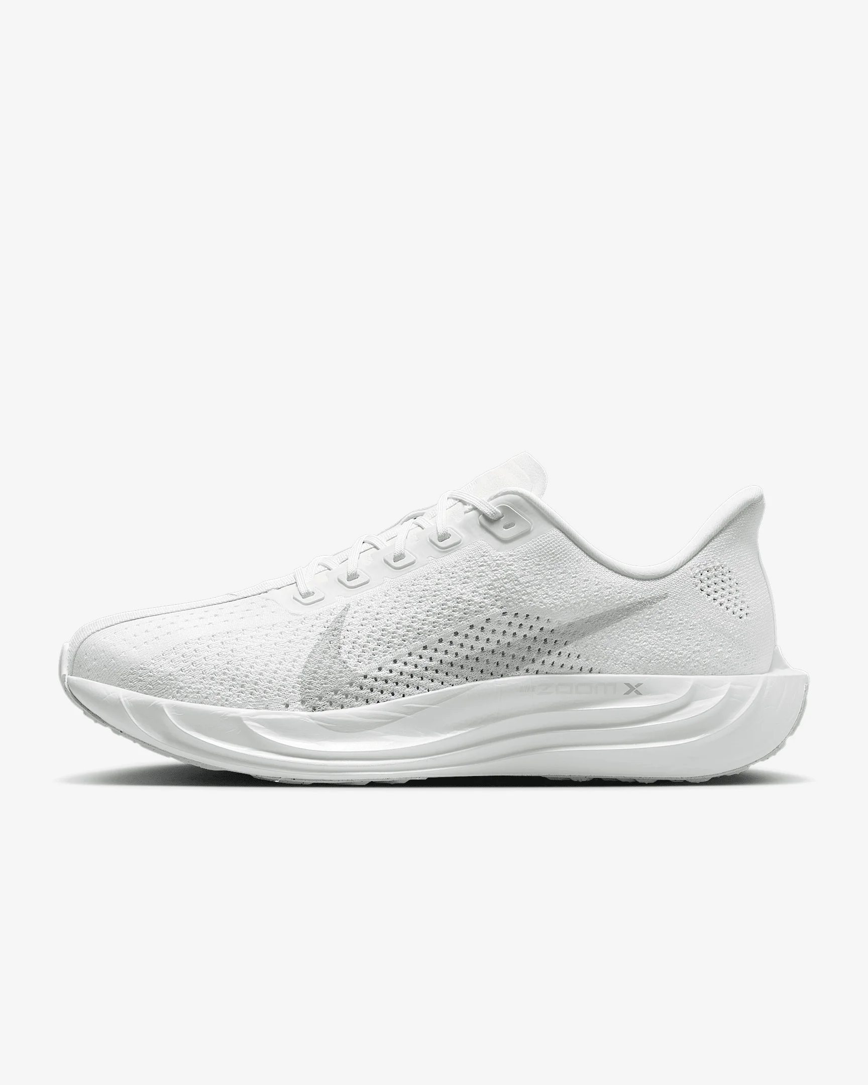 Take responsive cushioning to the next level with the Pegasus Plus. It energizes your ride with full-length, superlight ZoomX foam to give you a high level of energy return for everyday runs. And a stretchy Flyknit upper conforms to your foot for a seamless fit. Benefits - Flyknit on upper has perforations to help reduce the weight of the shoe and make it more breathable. - ZoomX foam midsole offers springy cushioning. - High-abrasion rubber on outsole provides traction. - Midfoot band helps keep you contained. Product Details - Weight: Approx. 245 g/8.6 oz (Men's US 10) - Heel-to-toe drop: 10 mm - Not intended for use as Personal Protective Equipment (PPE) - Shown: White/Wolf Grey/Pure Platinum - Style: FQ7262-102