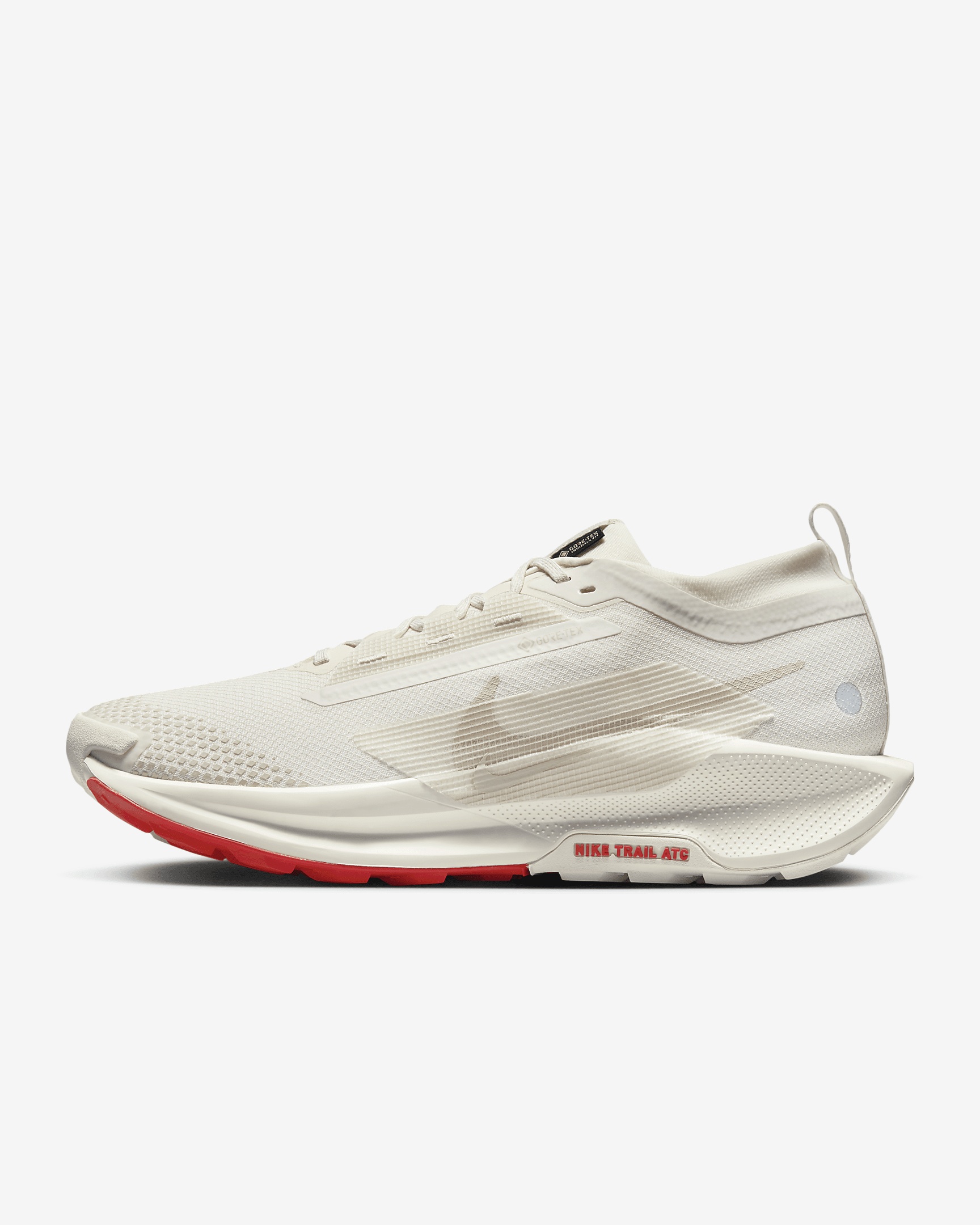 The winterized Pegasus Trail 5 provides wet-weather protection for trail running. A waterproof GORE-TEX upper, an all-terrain outsole and reflective details help you comfortably take on the elements. Combined with an Air Zoom unit and a ReactX foam midsole, it gives you responsive cushioning for an energized ride. Benefits - Waterproof GORE-TEX upper and 3-D print toe cap help keep water out so your feet stay dry. - ReactX foam midsole give you lightweight energy return. - Nike Trail ATC outsole is made with an all-terrain compound that’s great even in wet weather. - Sturdy, high ankle cuff helps keep debris and trail rubble from entering your shoe. - What's new? All-new ReactX foam midsole is 13% more responsive than previous React technology. - Crafted for performance and planet, ReactX foam is engineered to reduce its carbon footprint by at least 43% in a pair of midsoles due to reduced manufacturing process energy compared to prior React foam. The carbon footprint of ReactX is based on cradle-to-gate assessment reviewed by PRe Sustainability B.V and Intertek China. Other midsole components such as airbags, plates or other foam formulations were not considered. Product Details - Reflective detail on the side of the heel - Not intended for use as Personal Protective Equipment (PPE) - Weight: Approx. 300 g/10.5 oz (Men's US 10) - Heel-to-toe drop: 9.5 mm - Shown: Sail/Picante Red/Light Orewood Brown - Style: FQ0908-100