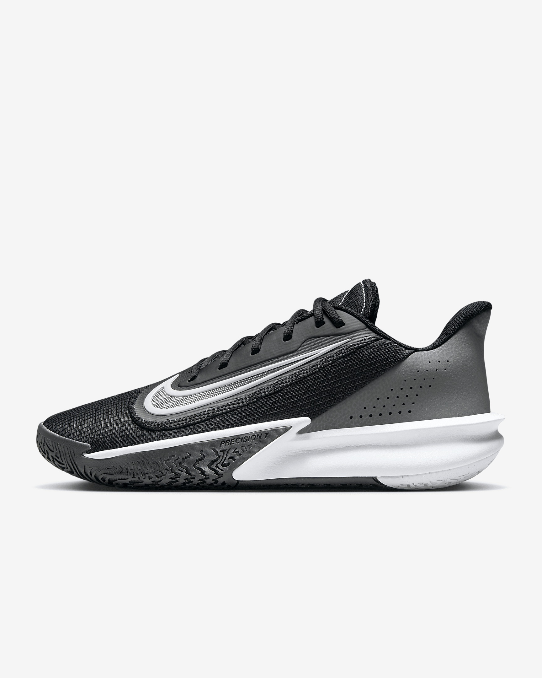 Score at will at the rim or from deep in the Nike Precision 7. Crafted with a combination of ground control, comfort and on-court traction, it's perfect for instant impact plays when your name is called for the next pickup game. Check in and make the plays that swing the outcome in your favor. More Benefits - Lace positioning and midfoot webbing loops help you stay secure. - Low collar provides mobility at the ankle. - Visible cutout in the foam helps reduce weight. Product Details - No-sew overlays - Molded Swoosh logo - Shown: Black/Iron Grey/Smoke Grey/White - Style: FN4322-005