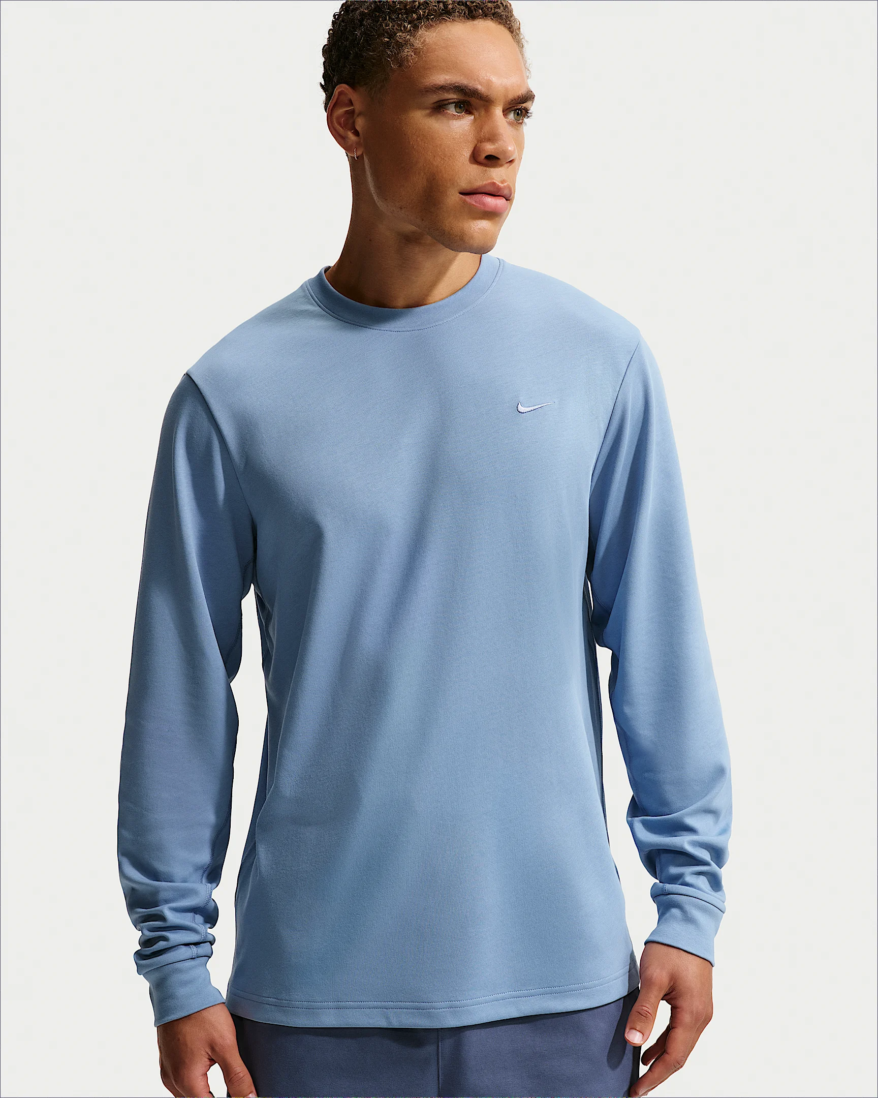 From weekly errands to workout classes to impromptu meetups with friends, life is a balance. Stay active and do it all with the Primary Top. Soft knit fabric (with eyelets for ventilation) helps you feel fresh all day. Nike Dri-FIT technology moves sweat away from your skin for quicker evaporation, helping you stay dry and comfortable. Benefits - Soft knit fabric is lightweight and breathable. - Embroidered eyelets provide extra breathability. Product Details - Ribbed collar and cuffs - Embroidered Swoosh logo at chest - Body: 60-62% cotton/38-40% polyester. Rib: 97-100% cotton/0-3% spandex. - Material percentages may vary. Check label for actual content. - Machine wash - Imported - Shown: Work Blue/Work Blue - Style: FB8585-486 SIZE & FIT Model is wearing size M and is 6'3"191cm Standard fit: easy and traditional