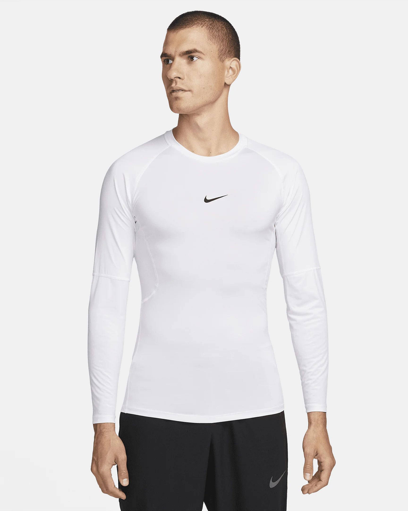 The Nike Pro collection is designed to help you feel confident pushing your limits, no matter how far along your exercise journey you are. This slim-fitting long-sleeve top has a smooth and stretchy feel perfect for high-intensity sports and activity. Extended hems in the front and back allow you to be comfortable while wearing the top tucked or untucked. Product Details - 90% polyester/ 10% spandex - Machine wash - Imported - Shown: White/Black - Style: FB7919-100 SIZE & FIT Model is wearing size M and is 6′1″185cm Tight fit: snug and form-fitting
