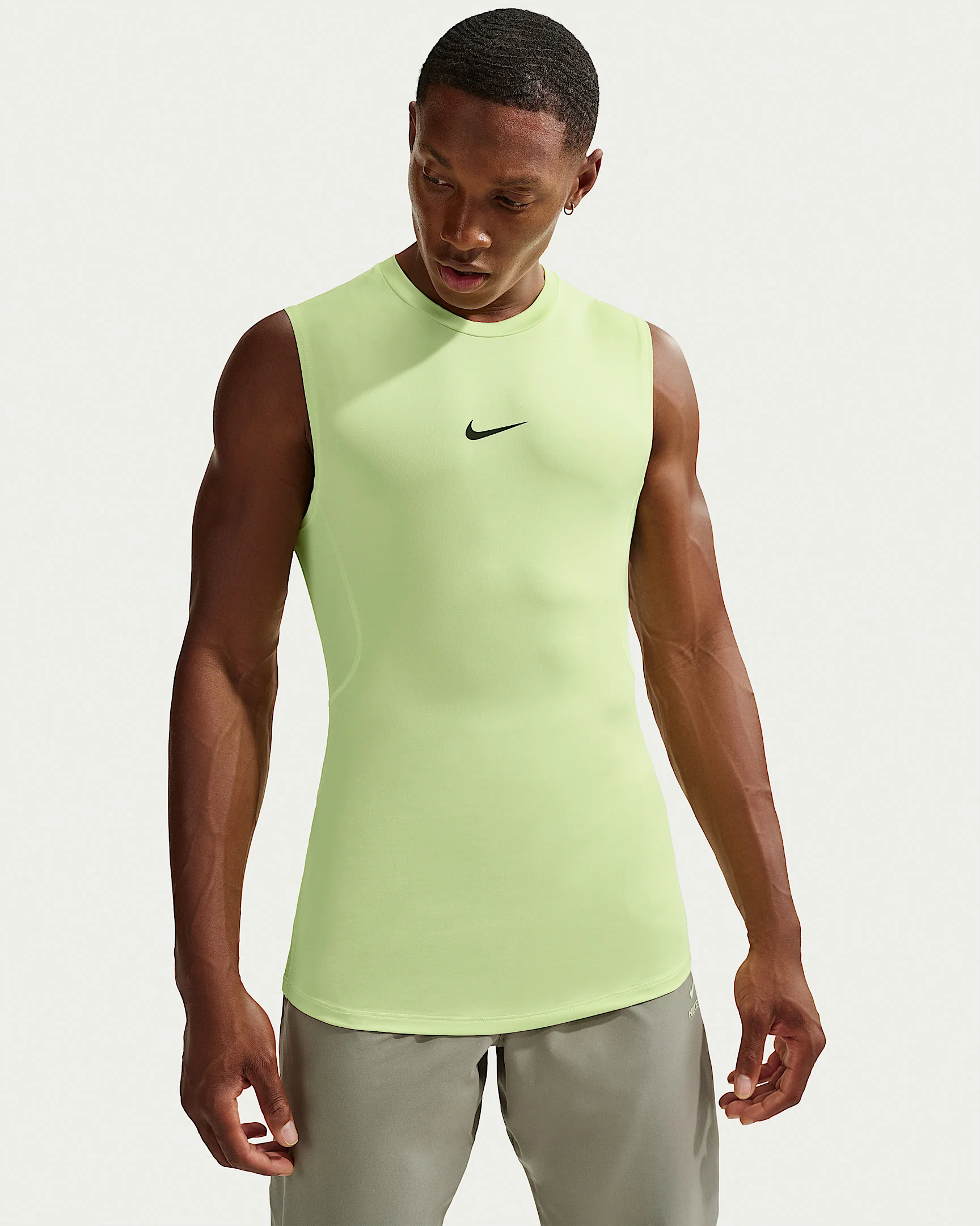 The Nike Pro collection means feeling confident no matter where you are on your workout journey. This slim-fitting sleeveless top has a smooth and stretchy feel to keep you comfortable through the sports and activities you love. Plus, our designers created a rounded hem for extra coverage when it's untucked and a more secure feel when it's tucked. Product Details - 90% polyester/ 10% spandex - Machine wash - Imported - Shown: Light Liquid Lime/Black - Style: FB7914-360 SIZE & FIT Model is wearing size M and is 5'11"179cm Big & Tall model is wearing size 3XL and is 6'5"196cm Tight fit: snug and form-fitting