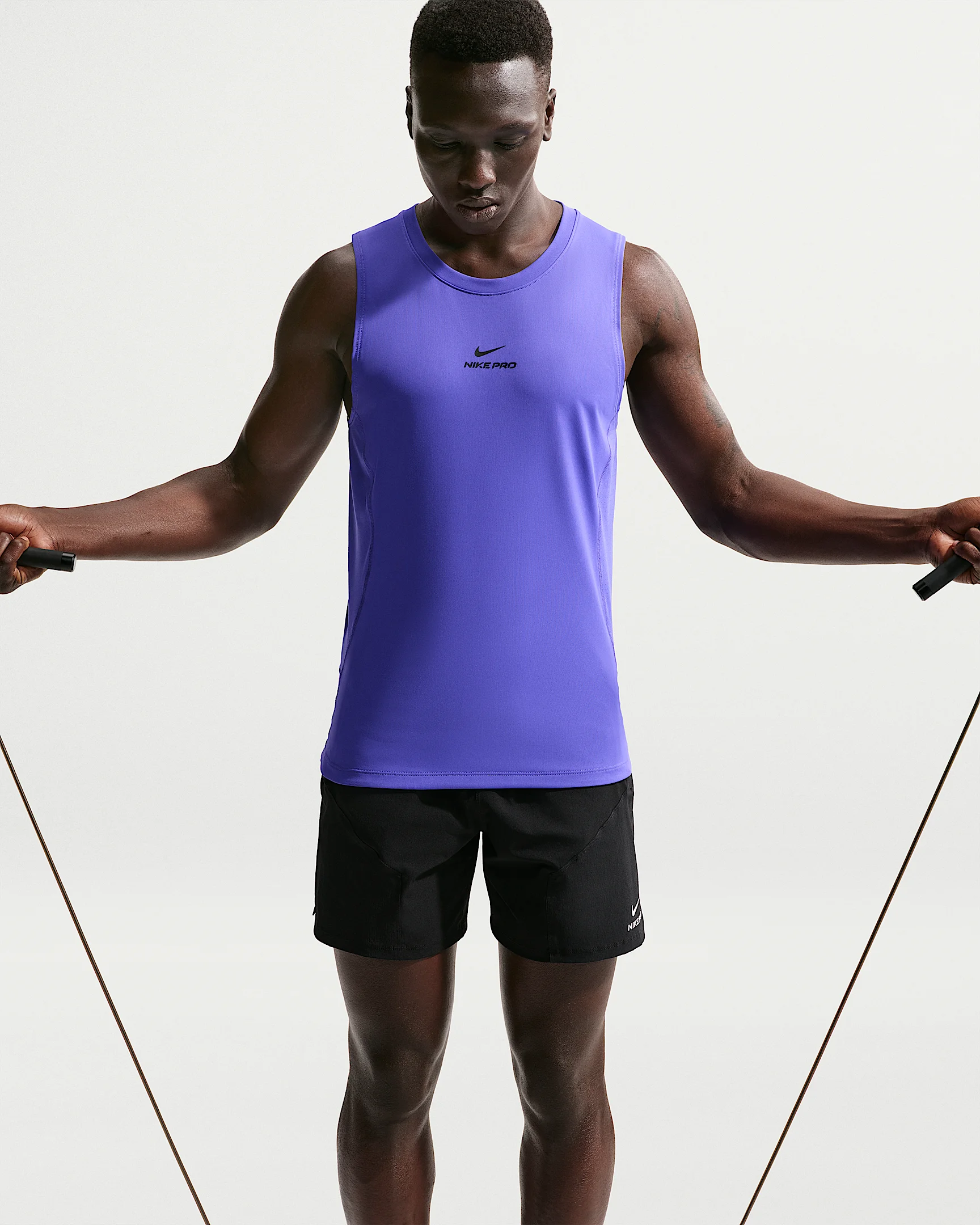 Train with ease in this slim-fit Nike Pro tank, combining sweat-wicking Dri-FIT technology and smooth, breathable fabric. Curved hems provide the coverage you need for even the toughest workouts. Benefits - Nike Dri-FIT technology moves sweat away from your skin for quicker evaporation, helping you stay dry and comfortable. - Extended back hem provides extra coverage. - Mesh panels on the back and sides enhance breathability for cool, comfortable training. Product Details - 100% polyester - Machine wash - Imported - Shown: Persian Violet/Black - Style: IF2805-510 SIZE & FIT Model is wearing size M and is 6′0″183cm Sm fit: sleek and tailored