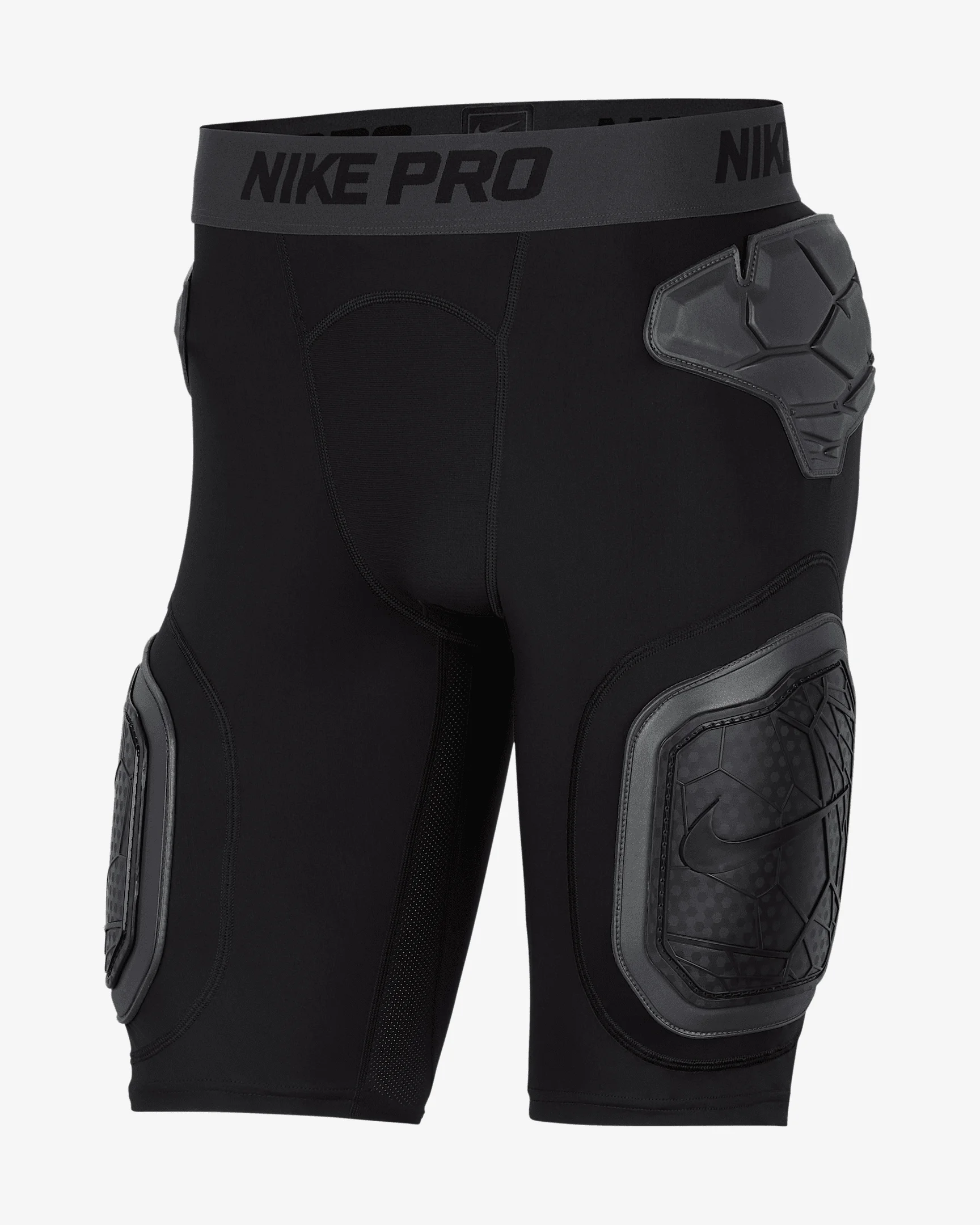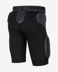 The Nike Pro HyperStrong shorts integrate protective panels and foam padding into lightweight form-fitting fabric for enhanced impact absorption. Product Details - Flat seams - Elastic waistband - Body: 78% polyester/22% spandex. Panels/center front panel/center front lining: 82% polyester/18% spandex. Pad: 100% EVA. Plate: 100% polyethylene. - Machine wash - Imported - Shown: Black - Style: N1013489-068