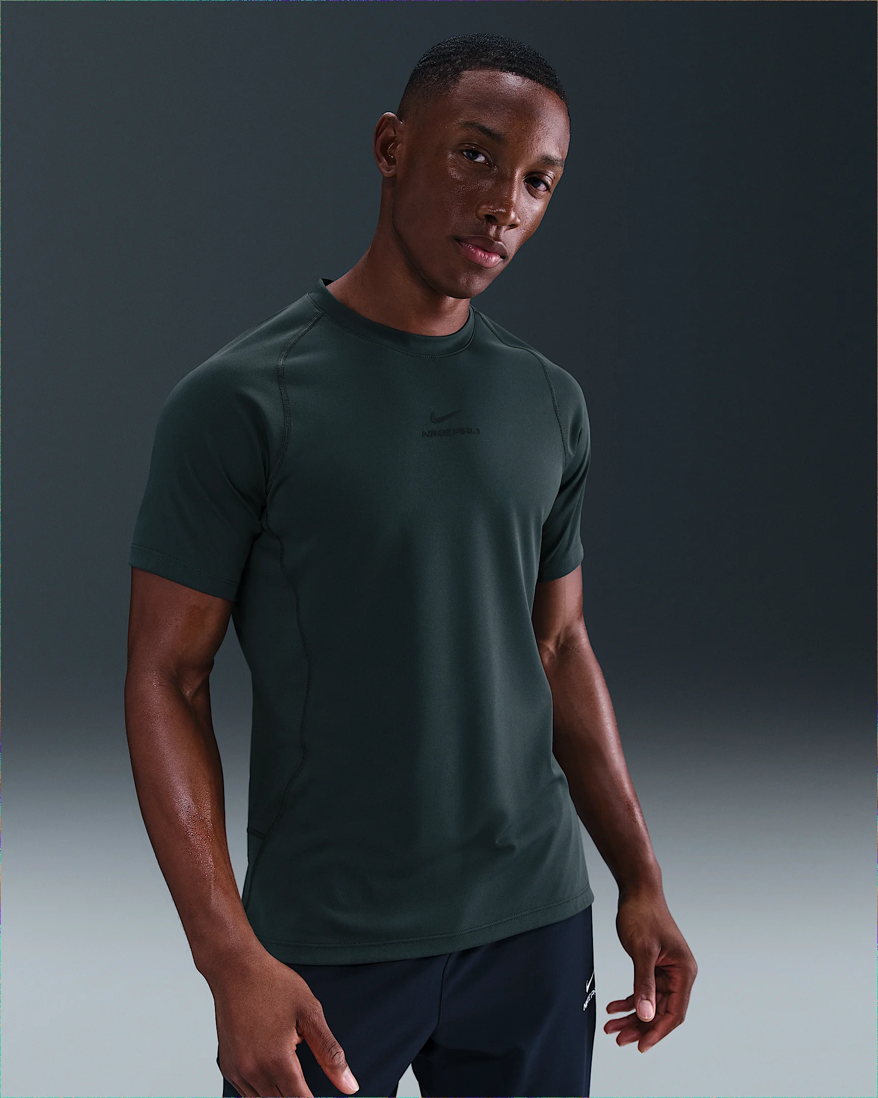 Train with ease in this Nike Pro top, combining sweat-wicking Dri-FIT technology and smooth, breathable fabric. Curved hems provide the coverage you need for even the toughest workouts. Benefits - Nike Dri-FIT technology moves sweat away from your skin for quicker evaporation, helping you stay dry and comfortable. - Extended back hem provides extra coverage. - Mesh panels on the back and sides enhance breathability for cool, comfortable training. - Reinforced collar with clear taping provide extra durability. Product Details - 100% polyester - Machine wash - Imported - Shown: Seaweed/Black - Style: HV0409-390 SIZE & FIT Model is wearing size M and is 5′11″179cm Sm fit: sleek and tailored
