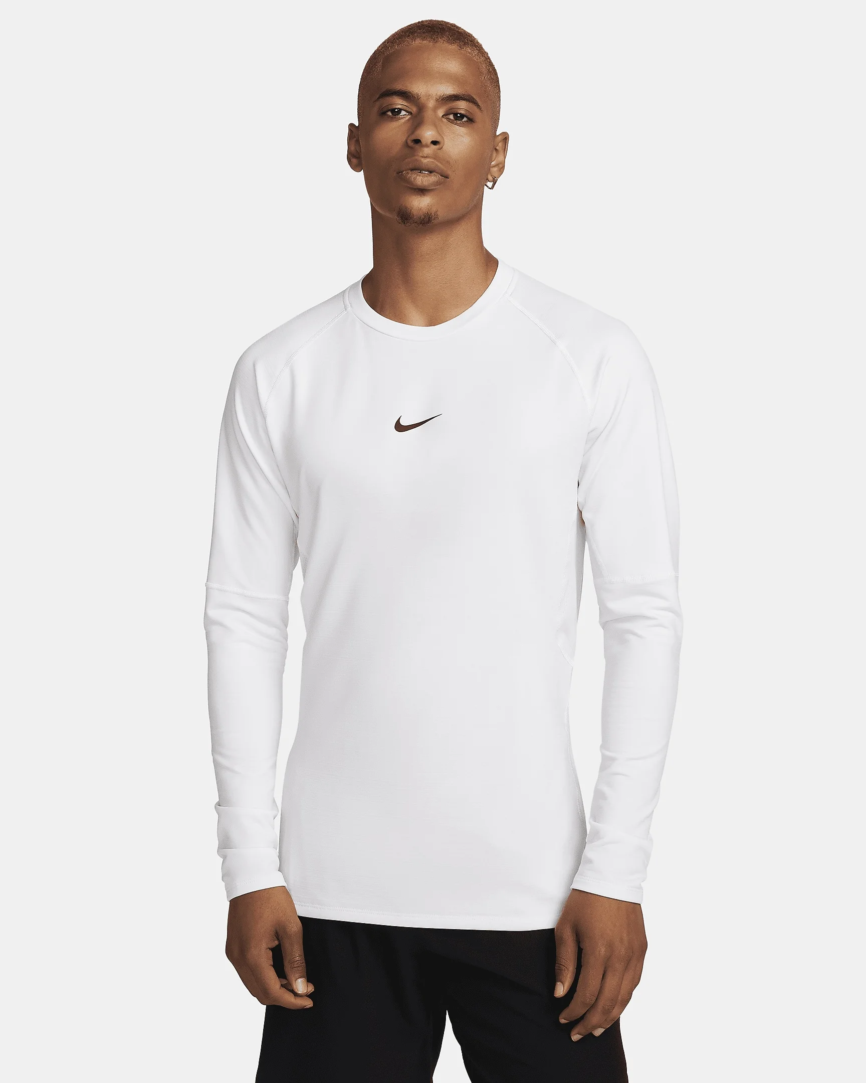 There's no need to dread your workout when the cold weather hits thanks to the Nike Pro Warm collection. This long-sleeve crew is made with soft and stretchy French terry and breathable panels to help you stay comfortable during your favorite sports and activities. Nike Dri-FIT technology moves sweat away from your skin for quicker evaporation, helping you stay dry and comfortable. A round hem offers security when you tuck the shirt in and gives you more coverage when it's left untucked. Product Details - Body: 88% polyester/12% spandex. Rib: 92% polyester/8% spandex. - Machine wash - Imported - Shown: White/Black - Style: FB7982-100 SIZE & FIT Model is wearing size M and is 6′1″185cm Sm fit: sleek and tailored