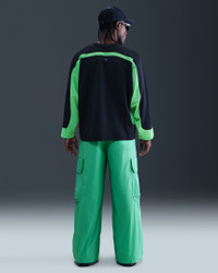 These expressive oversized cargos are crafted with a lightweight, semi-transparent ripstop that repels water. Elastic bungees offer flexibility with styling around your shoes. Benefits - Oversized fit is extra roomy through the seat and thighs. - Water-repellent finish helps keep you dry in wet weather. - An elastic waistband and external drawcord let you draw in a perfect fit. - Large cargo pockets have snap closures. Product Details - Silicone Nike Project F.R.O.G. branding - Hand pockets - Body: 100% nylon; Lining: 100% polyester. - Machine wash - Imported - Shown: Green Shock/Hyper Royal/White/Hyper Royal - Style: HV0907-388