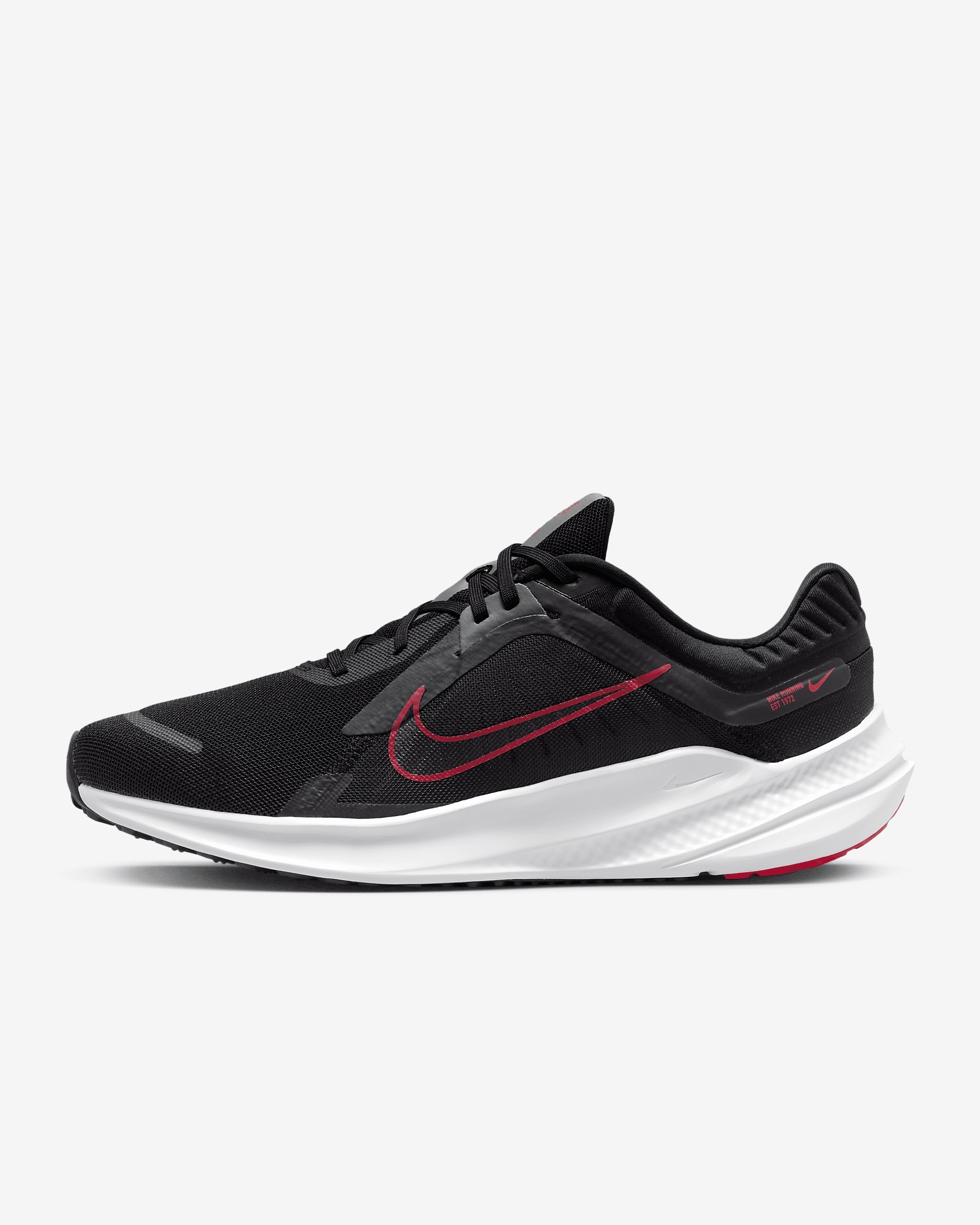 You lace up in pursuit of new personal goals. Let the Nike Quest 5 help you reach those aspirations. This neutral trainer gives you a smooth, comfortable ride with plenty of traction. We focused on our foam, adding more cushioning for a better transition from heel to toe. More Benefits - Supersoft padding and cushioning at the collar help keep your ankle comfortable. - Skins at the toes and eyelets offer durability. Product Details - Shown: Black/Smoke Grey/University Red - Style: DD0204-004